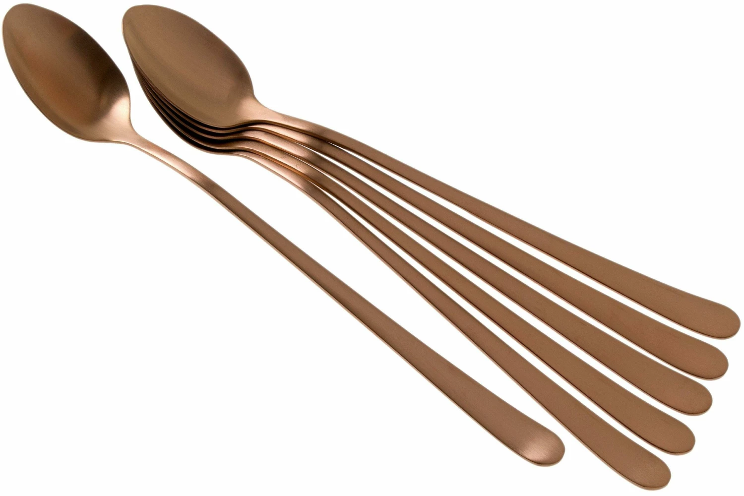 Las modernas Cucharas de sorbete Austin 1410/Cucharas de latte macchiato tienen un color cobrizo que les da un aspecto muy lujoso. Están fabricadas en acero inoxidable 18/0 y mejoradas con un fino revestimiento de PVD de titanio. La longitud de estas cucharas es de 20 cm.
