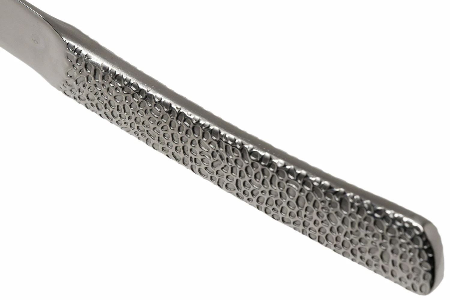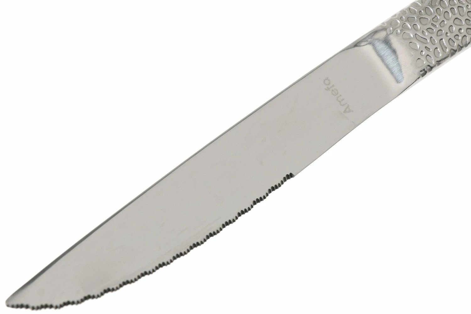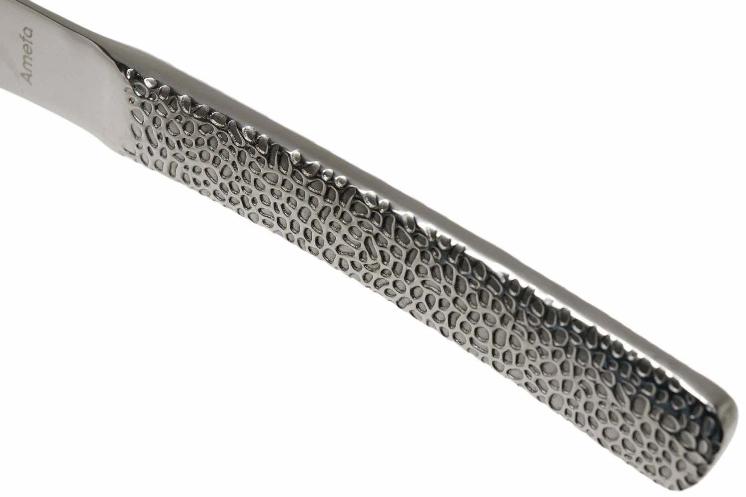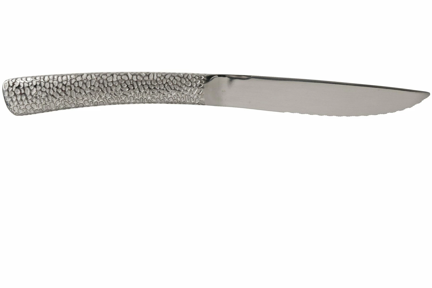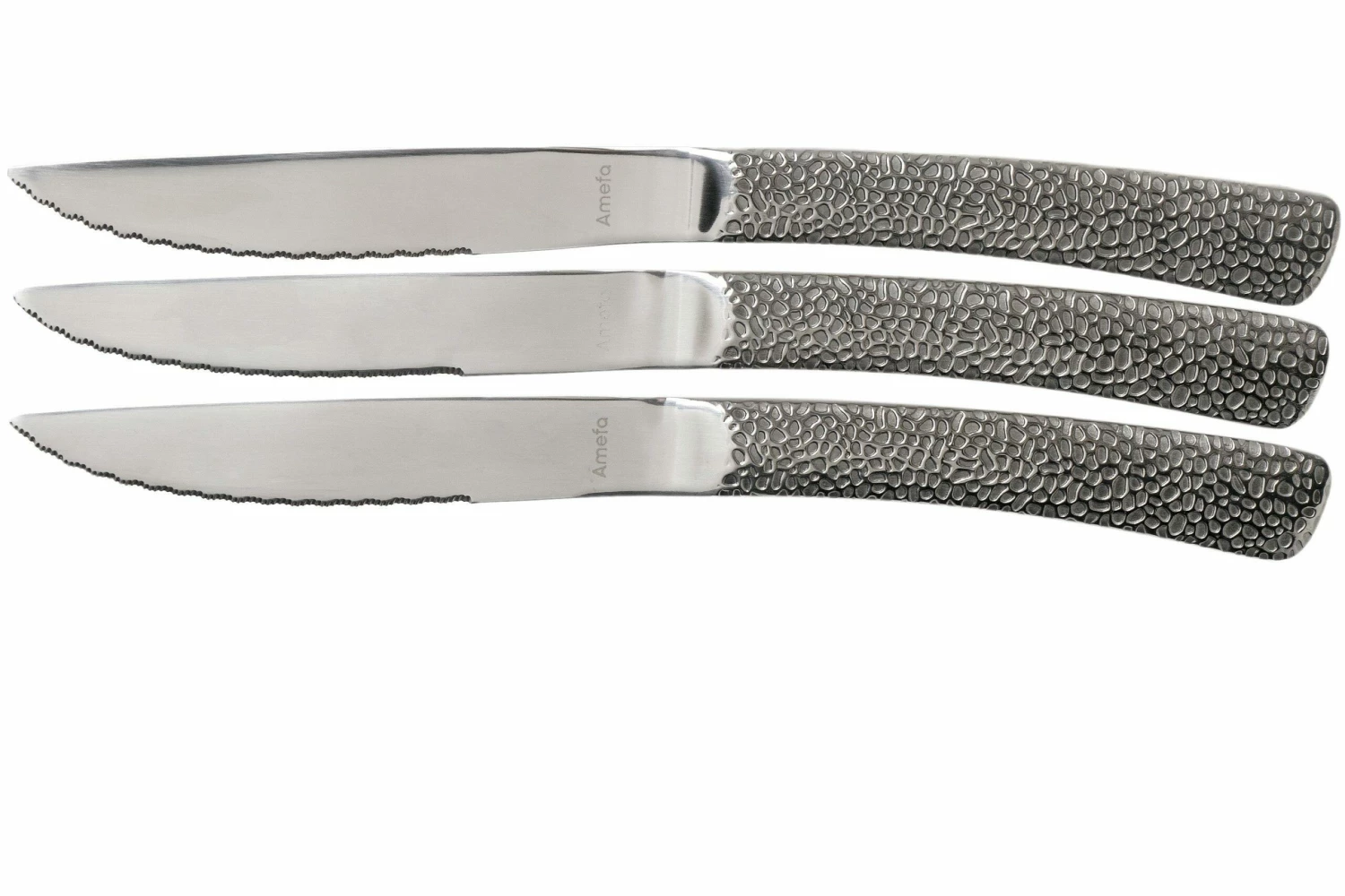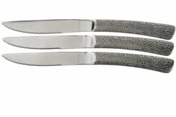 Estos tres cuchillos para carne Amefa Bongo se sienten muy bien en la mano gracias al mango extra ancho. El filo de los cuchillos está mejorado con un microdentado. De este modo, se puede cortar fácilmente un trozo de carne sin desgarrarlo. Además, los cuchillos tienen un aspecto increíble gracias al diseño “martillado” del mango.