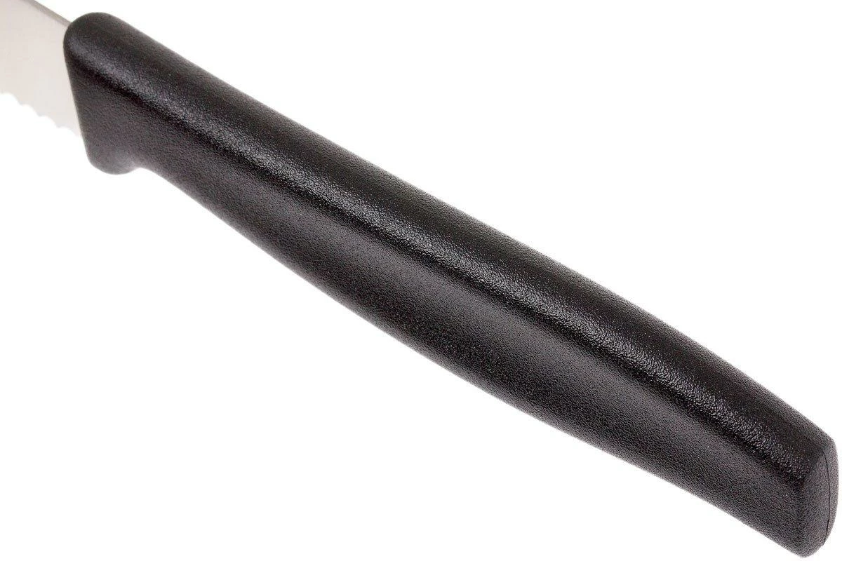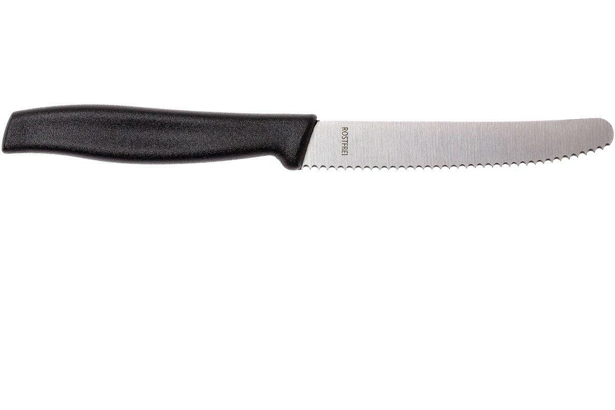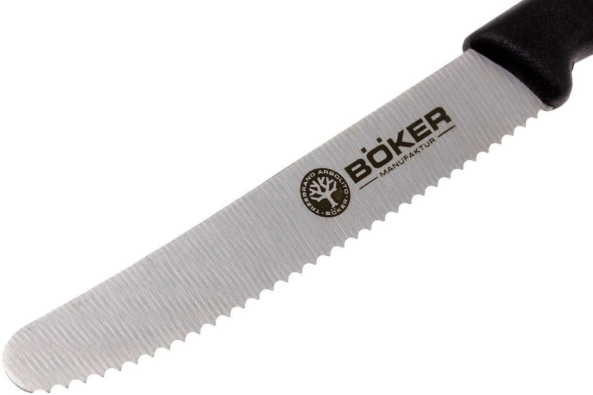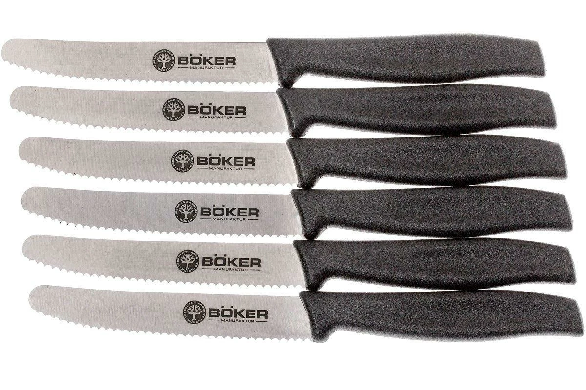 Este juego de cuchillos Böker se compone de seis cuchillos dentados. Perfecto para cortar bollos duros o croissants. La hoja está fabricada en acero inoxidable y mejorada con un filo dentado. El mango es de plástico.