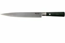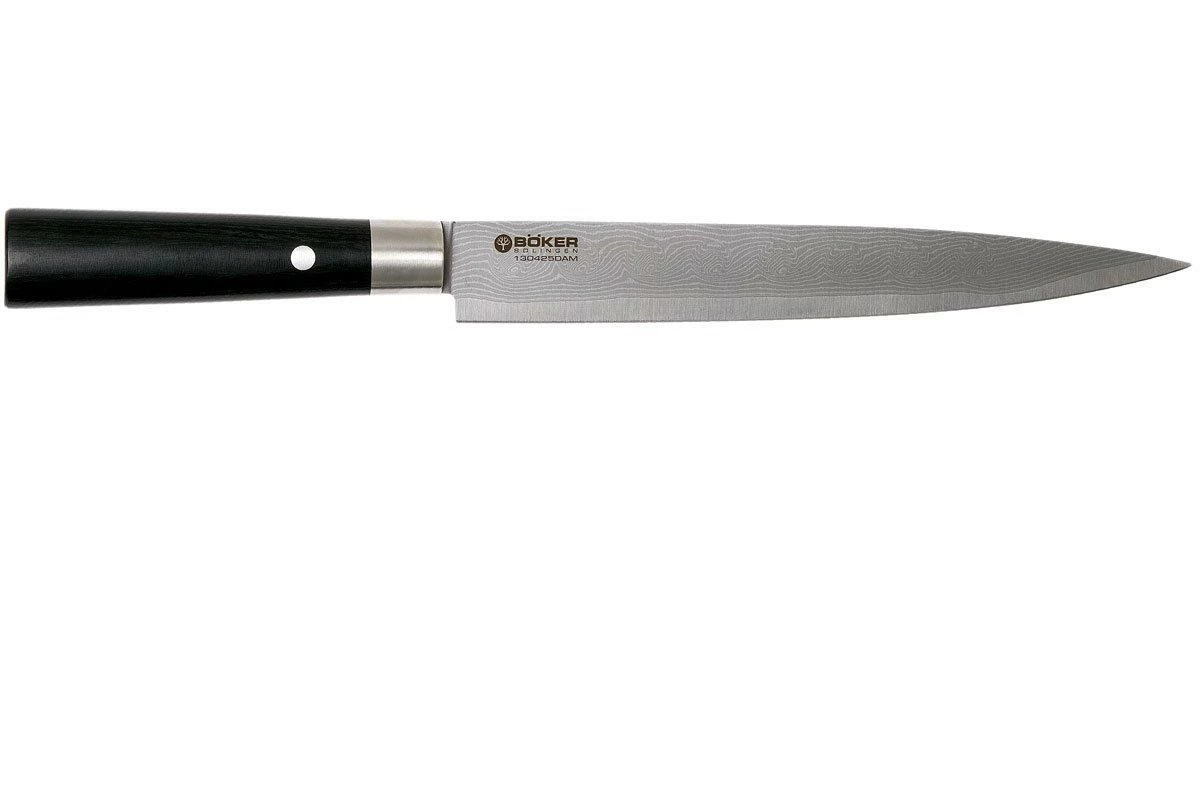 Este cuchillo de trinchar Böker Damast Black está hecho para cortar carne y pescado. Gracias a la hoja estrecha y larga se puede cortar con mucha precisión. Tanto si deseas obtener trozos, como cubos o rodajas: este cuchillo para trinchar puede hacerlo todo.