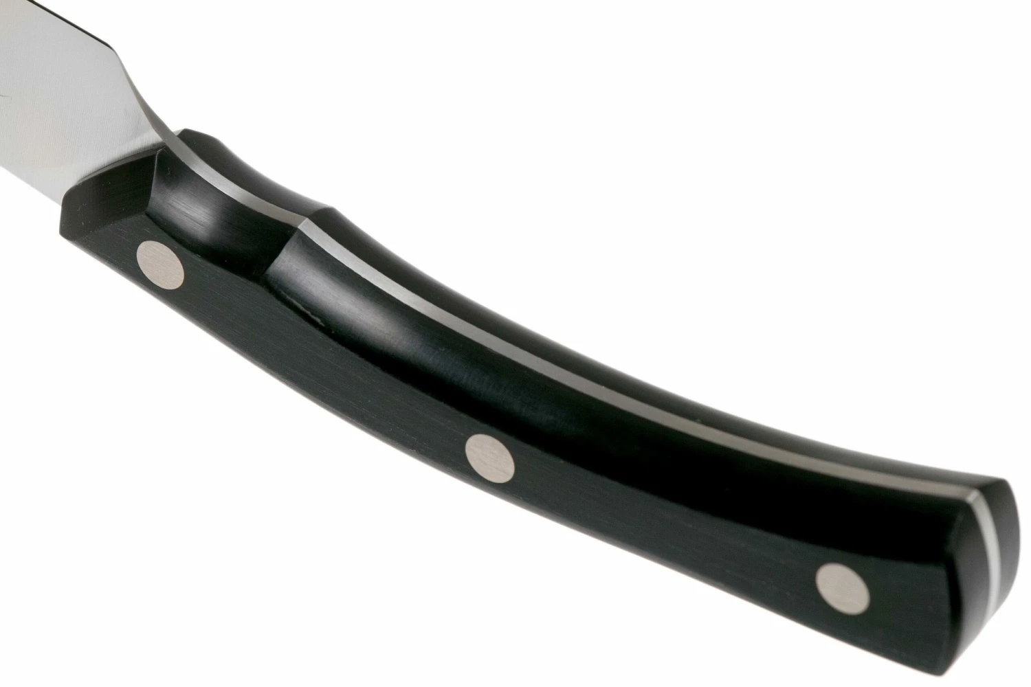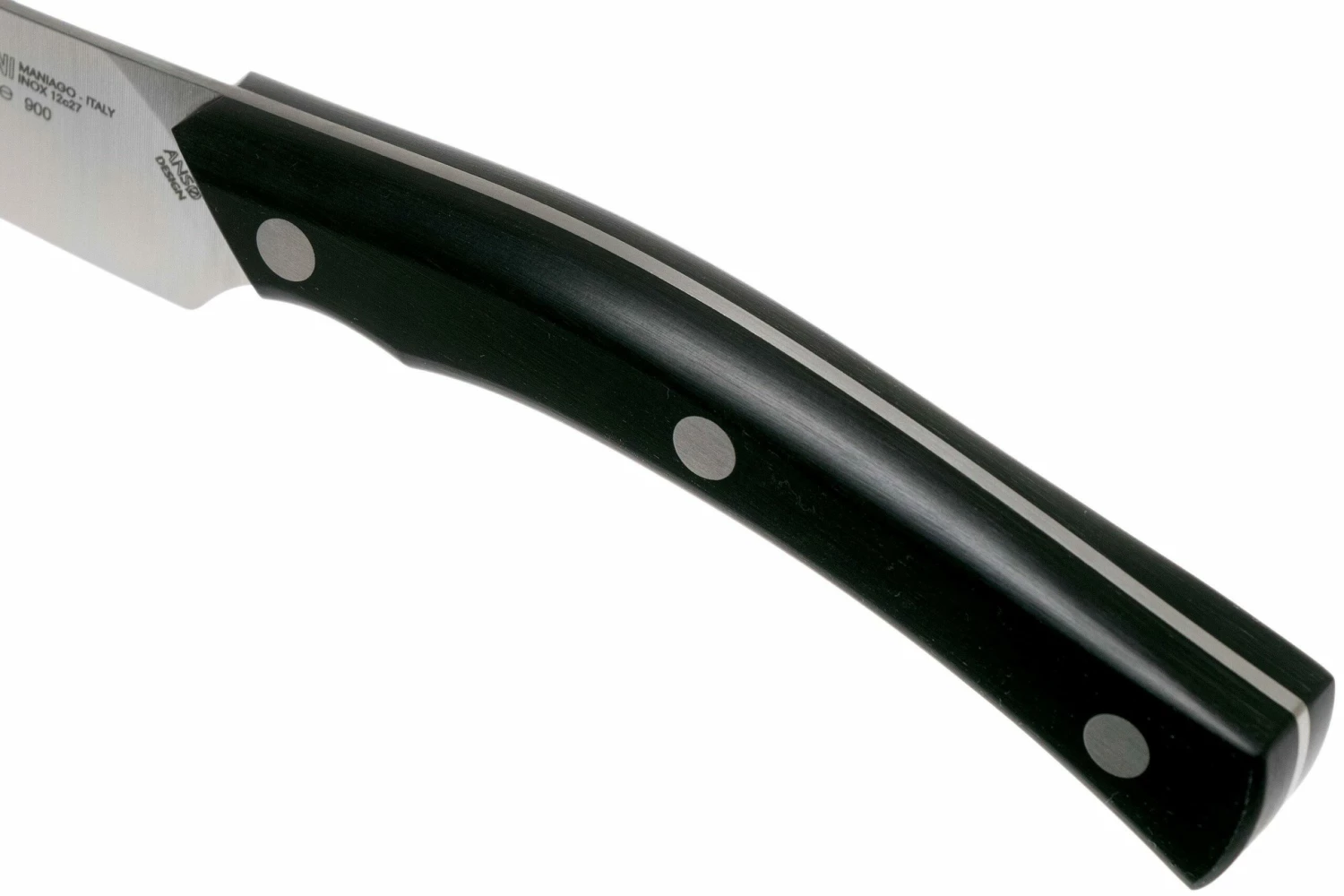 Este cuchillo para carne de la Línea Arne de Due Cigni es uno de los más sutiles de esta colección. No es demasiado grande, pero tampoco desaparece en la mesa. La notable forma de la hoja y el mango curvado (para evitar la fatiga) hacen que este cuchillo sea único. No es de extrañar si se tiene en cuenta que los cuchillos de esta colección han sido diseñados por el cuchillero danés Jens Ansø. Como es habitual en los diseños de Ansø, la perfección y la funcionalidad son la clave. Y se nota cuando se mira el cuchillo.