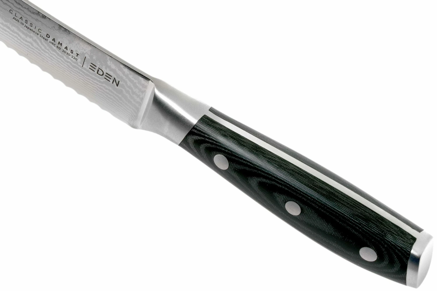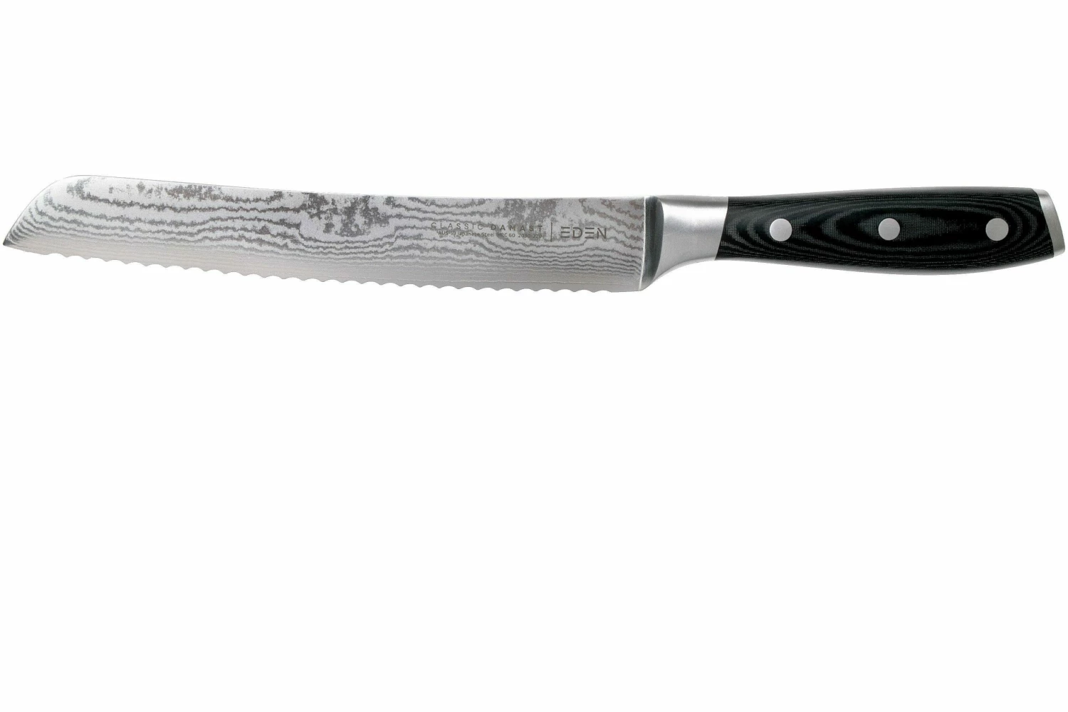 El cuchillo de pan Eden Classic Damast está diseñado para cortar todo tipo de pan. Desde cortezas duras a blandas y desde el pan de molde a la baguette: el filo dentado se deslizará fácilmente a la hora de cortar.