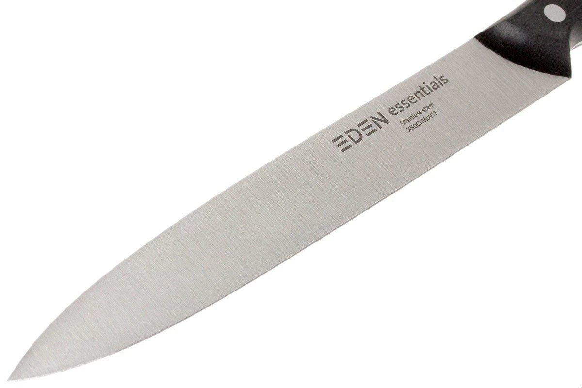 El cuchillo de trinchar Eden Essentials tiene una hoja larga y estrecha. Es perfecto para cortar todo tipo de carnes. Gracias a su estrecha hoja, la carne no se pegará al cuchillo. Además, su longitud te permitirá realizar cortes largos y rectos. Al cortar, utiliza toda la superficie de la hoja y corta los productos de una sola vez.