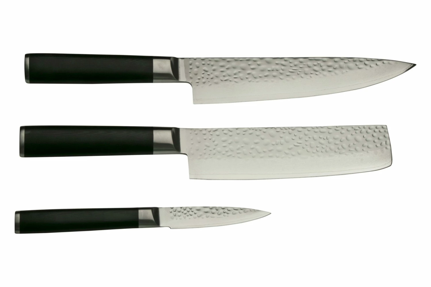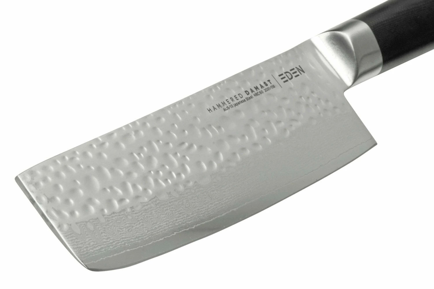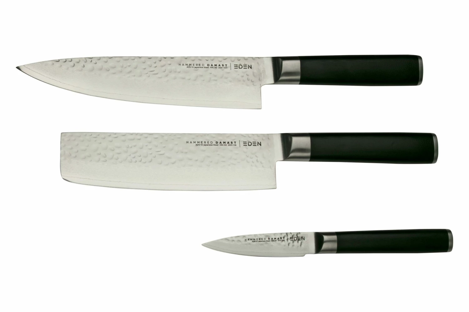 El juego de cuchillos Eden Hammered Damast de 3 piezas contiene tres joyas afiladas para tu cocina. Elegantes pero muy prácticos. Gracias a su pequeña hoja, el cuchillo puntilla es perfecto para tareas pequeñas y detalladas en la cocina. Un Nakiri es un cuchillo tradicional japonés de verduras. La hoja alta y cuadrada es ideal para cortar rápidamente verduras, frutas y hierbas. Para los trabajos de corte más exigentes se utiliza el cuchillo de chef. Este versátil cuchillo es indispensable en cualquier cocina. Los detalles excelentes y la caja de madera para guardarlo completan el conjunto.