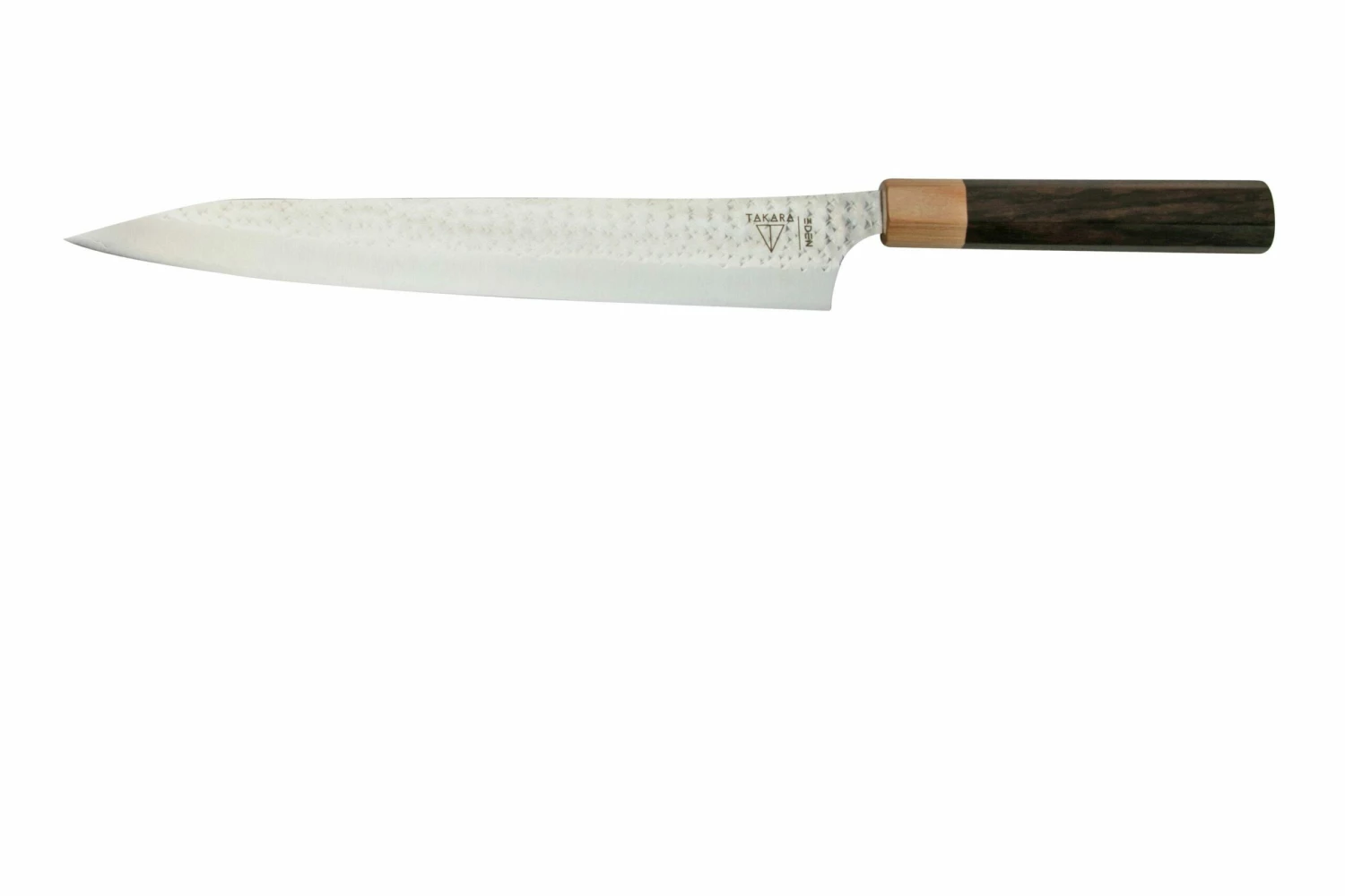El Eden Takara Sujihiki 27 cm es un cuchillo largo y afilado para cortar sashimi y sushi. Su larga hoja te permite cortar rodajas finas y rectas de carne y pescado con un solo movimiento.