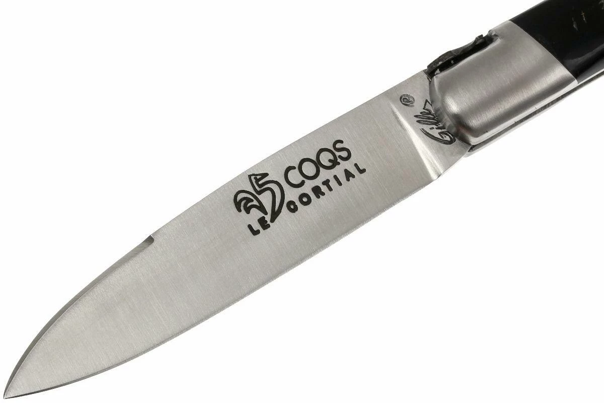 La serie “5 Coqs” de Fontenille Pataud debe su nombre a un pequeño pueblo, Yssingeaux, en Francia. Se pronuncia como “i-sin-jo” y significa, en el dialecto local, “cinco gallos jóvenes”. Los gallos no aparecen únicamente en el nombre de la serie de cuchillos. La hoja también presenta un gallo estilizado. El número “5” está bellamente realizado en forma de gallo. Y el dorso del cuchillo recuerda bastante a la cabeza de un gallo con cresta. Presta atención a los ojos del gallo, que presentan dos colores. Fíjate también en el esquilón de perlas que se ha añadido a la “mosca” alternativa, que tiene una forma casi de Ankh eqipcio.