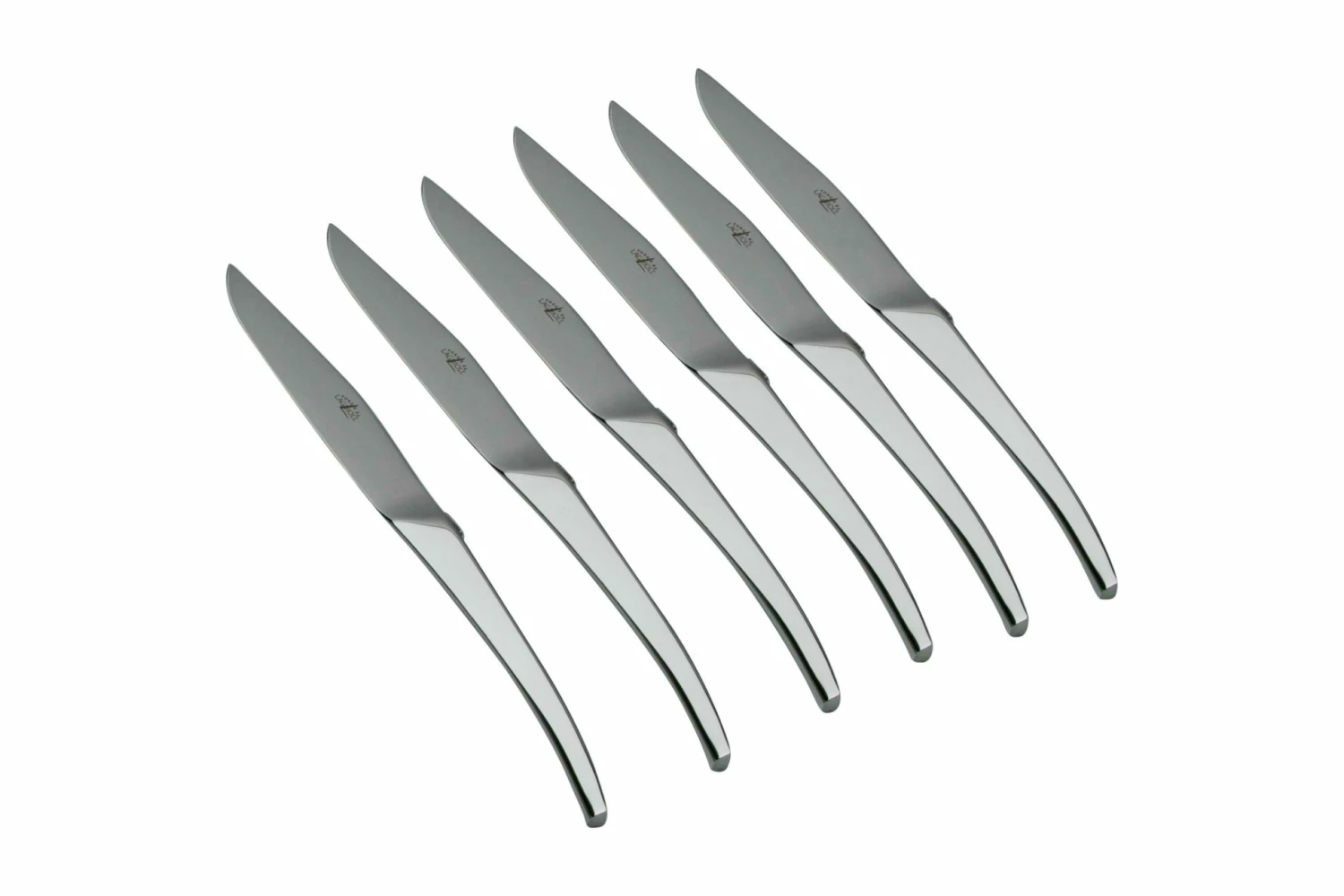 El Forge de Laguiole Skel Signature es un juego de cuchillos para carne de diseño moderno y elegante. Los cuchillos para carne fueron diseñados por los diseñadores franceses Catherine y Bruno Lefebvre. El diseño de estos cuchillos para carne sigue siendo similar al de los cuchillos Laguiole originales. Sin embargo, estos cuchillos están forjados en una sola pieza de acero inoxidable y tienen un mango triangular minimalista. Los cuchillos están pulidos con un acabado de alto brillo. Esto les da su aspecto elegante y, al mismo tiempo, resulta muy útil para comprobar si tu pelo sigue en su sitio durante la cena.