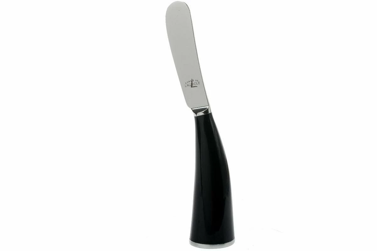 Elegante cuchillo de mantequilla de gran estilo, creado por Stéphane Rambaud. Este elegante cuchillo de mantequilla cuenta con una hoja de acero inoxidable y un disco que se encuentra en la base del mango. El mango en sí está hecho de la punta negra pulida de un cuerno de búfalo. Dado que la punta es la parte más dura y duradera del cuerno, el mango es robusto y resistente.
