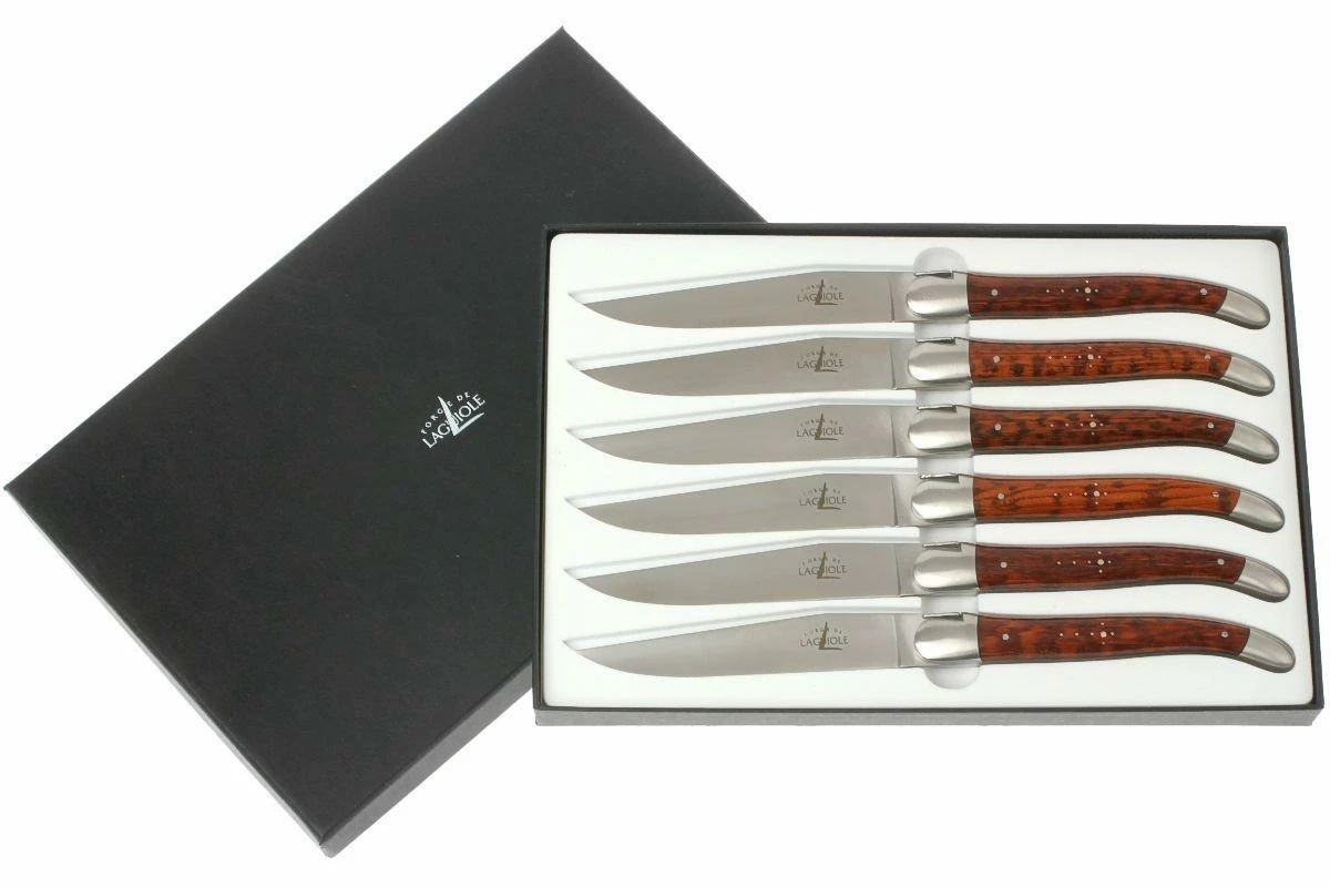 Este juego de cuchillos de mesa Forge de Laguiole se compone de seis hermosos cuchillos hechos a mano. La hoja afilada tiene un núcleo de acero inoxidable francés y conserva su filo durante mucho tiempo. Los mangos de madera de serpiente irradian lujo y están equipados con la característica cruz de pastor en forma de siete remaches. Y, por supuesto, la típica abeja de Laguiole también se encuentra en el lomo de las hojas.