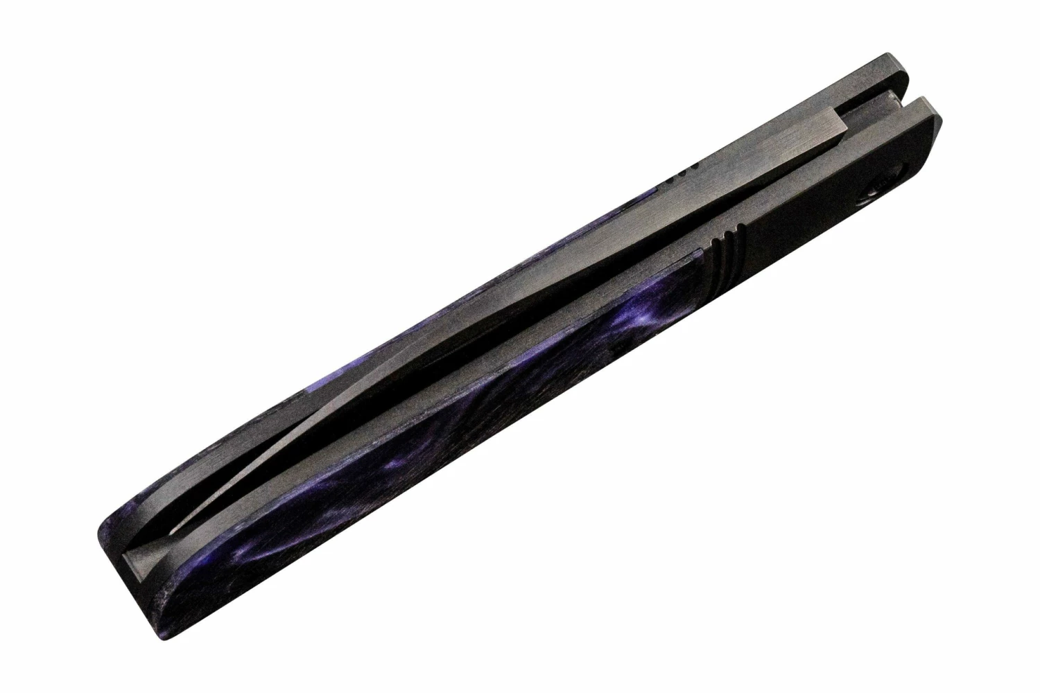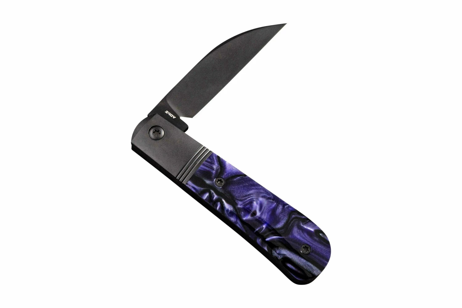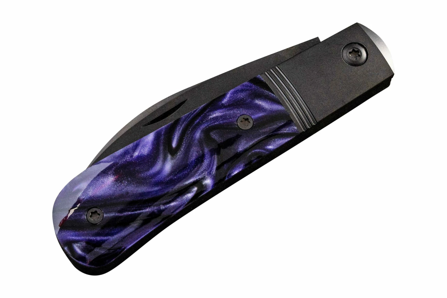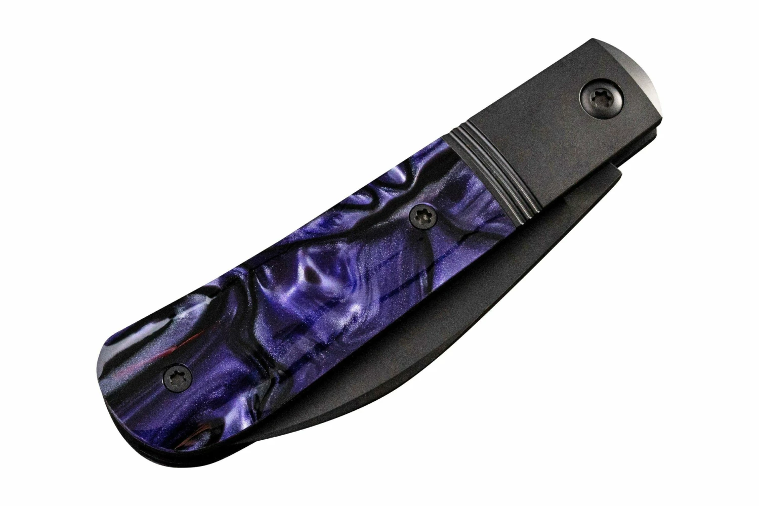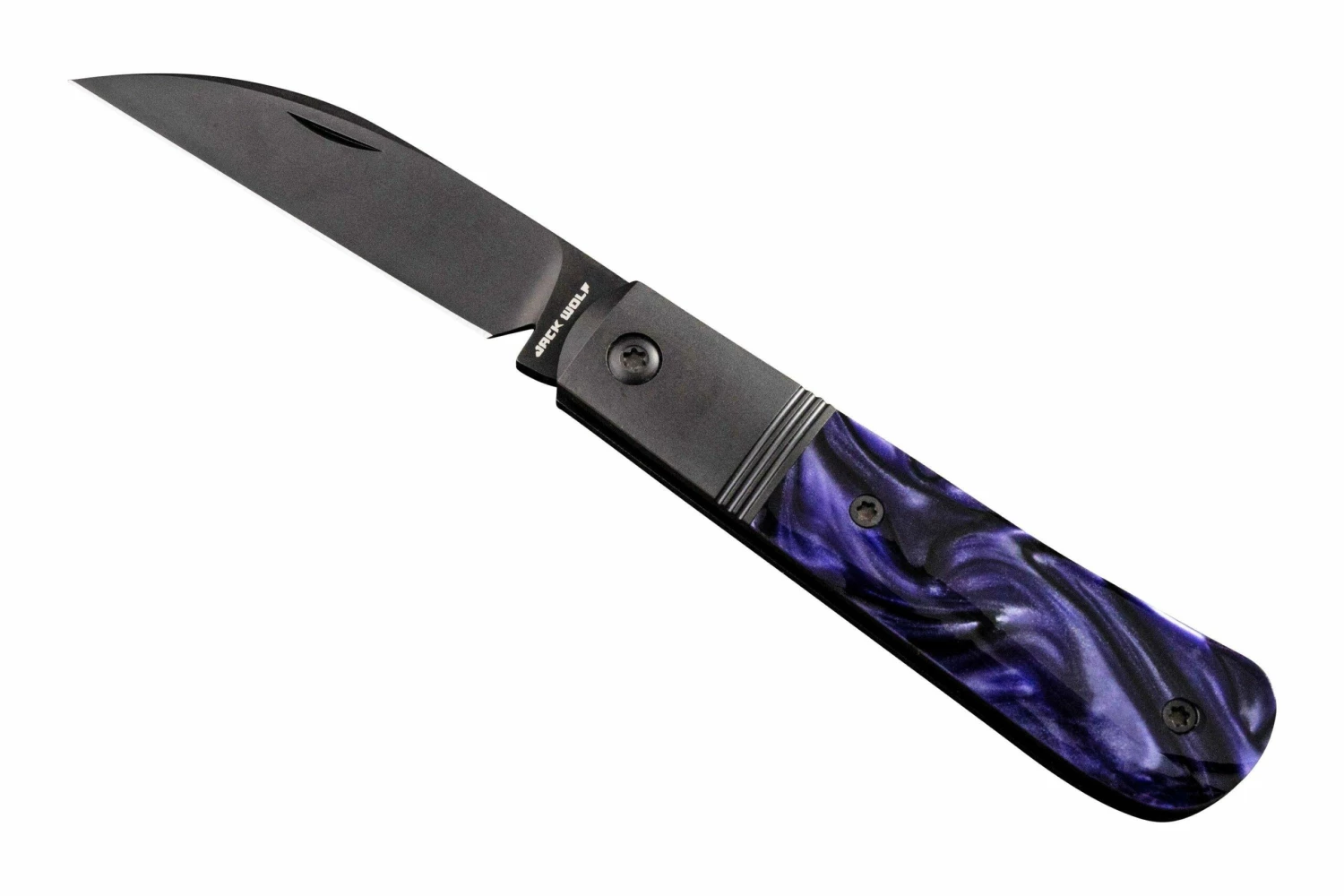 La Jack Wolf Knives Laid Back Jack Kirinite Purple Wave es una interpretación moderna de una navaja de bolsillo tradicional. El diseño de esta navaja es un “Swayback”. Lo que inspiró el nombre de la navaja. La Swayback es uno de los modelos de navajas tradicionales más populares. Este modelo es conocido por su forma de hoja Wharncliffe y su mango curvado. Esto da al patrón Swayback su aspecto elegante.