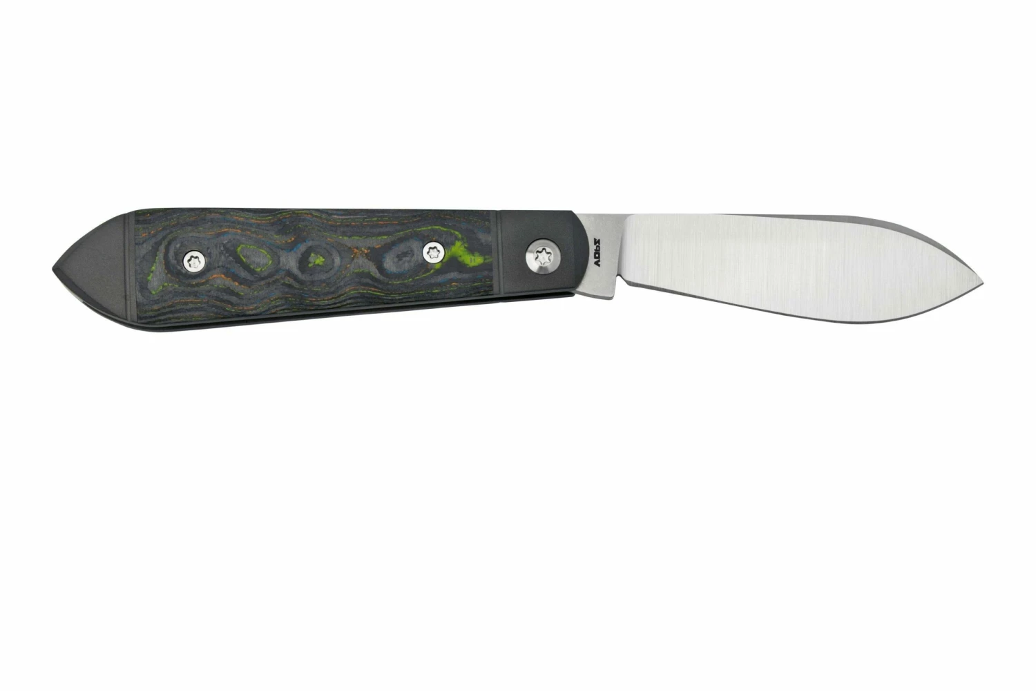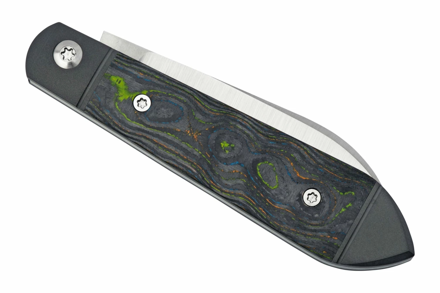 Con la Jack Wolf Knives Low Drag Jack Camo Carbon 80’s, Jack Wolf vuelve a lanzar una gran navaja tradicional. Esta vez con un patrón Teardrop, también llamado Bullet End. El cuchillo está mejorado con una hoja en forma de hoja de árbol con un vientre relativamente grande, que es lo que hace que este cuchillo sea perfecto para tareas de corte como destripar caza menor. Las excepcionales incrustaciones de micarta o fibra de carbono confieren al cuchillo un toque chic y moderno. Los largos cabezales de titanio son una parte integral de los revestimientos. Una elección extraordinaria y audaz.