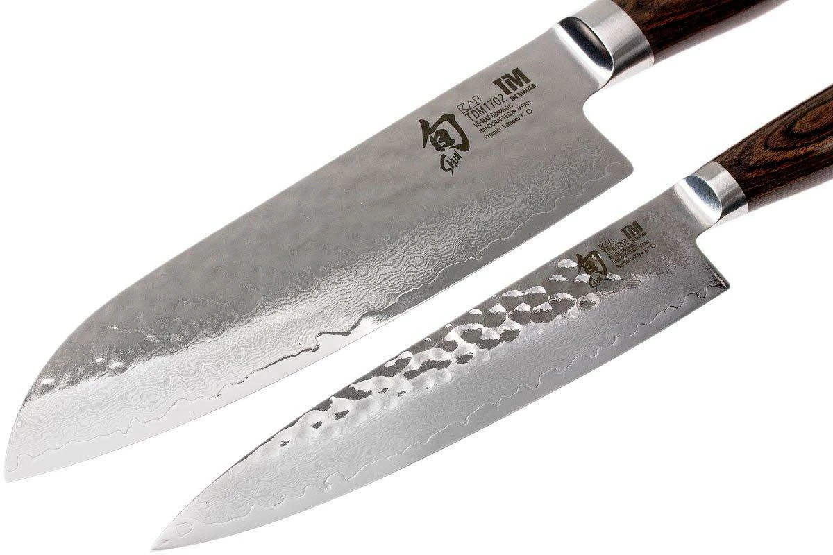 Los cuchillos Kai Tim Mälzer están equipados con la famosa estructura metálica en capas de damasco de KAI, combinada con un núcleo muy resistente de acero V-gold-10. La hoja ha sido martillada a mano al estilo japonés. Esta técnica se llama tsuchime. Esto no sólo garantiza un alto nivel de afilado y una bella apariencia, sino que también asegura que el producto que estás cortando se pegue mucho menos a la hoja. El núcleo de la hoja está en el exterior realzado con 32 capas de acero inoxidable de damasco. La dureza de estos cuchillos es de 61’1 HRC, que es excepcionalmente dura. Esto mantiene este cuchillo afilado durante mucho tiempo. El mango es de madera de nogal marrón y es muy cómodo en la mano tanto para zurdos como para diestros. Un bonito detalle es el logotipo de Tim Mälzer en el extremo del mango. En definitiva, un cuchillo bonito y funcional que se deja querer.