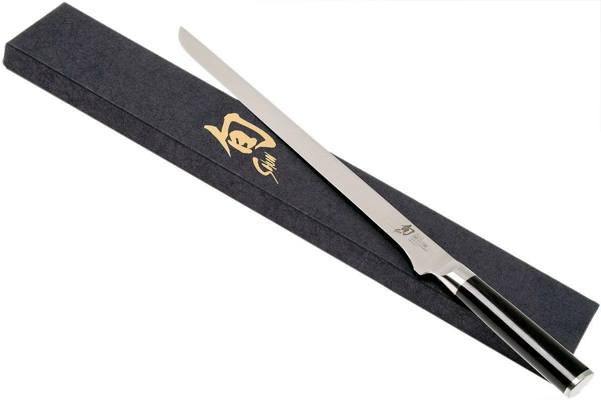La colección Shun Classic está compuesta por preciosos cuchillos de cocina con acero de damasco de 32 capas. El núcleo AUS8A asegura que el cuchillo es increíble de usar. Los mangos son de madera laminada de Pakka y tienen una forma asimétrica. Esta colección de cuchillos es una de las más extensas del mundo. Por su aspecto y por sus excelentes propiedades de corte, este cuchillo es un placer absoluto para la vista e increíble de usar. Cuchillo jamonero de la colección Shun.