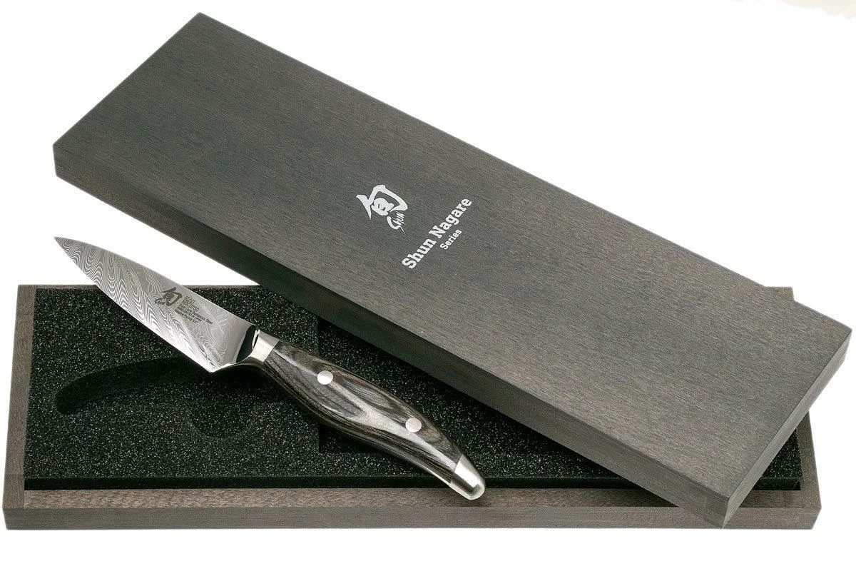 Este cuchillo puntilla Kai Shun Nagare de 9 cm es uno de los cuchillos de cocina de la impresionante colección Shun Nagare. Una colección única, mejorada con una hoja especial con un diseño llamativo. Al igual que cualquier otro cuchillo de esta colección, este cuchillo puntilla se entrega en una lujosa caja de madera, y viene con un certificado de autenticidad. Esta colección es una de las mejores en el mundo de los cuchillos de cocina y se nota. Cada cuchillo tiene un aspecto único y su uso es increíble.