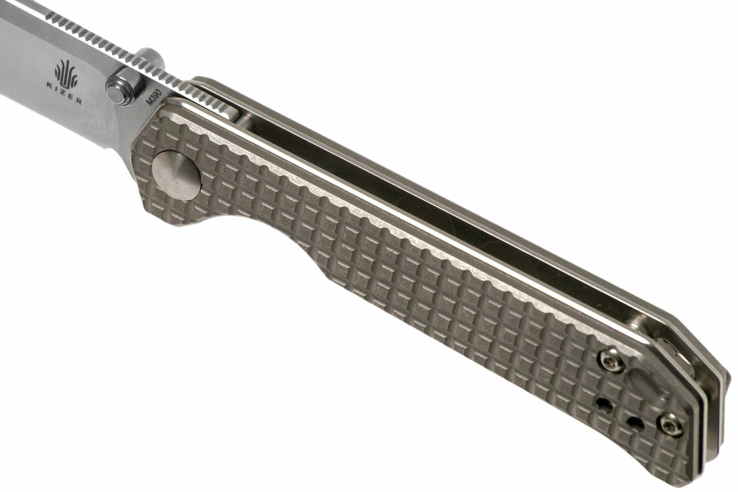 La Kizer Begleiter Mini es una navaja práctica y asequible para el uso diario. Gracias a las cachas de titanio, la navaja es agradable y ligera. Puedes abrir la navaja fácilmente con una sola mano gracias al perno para el pulgar en ambos lados de la hoja.