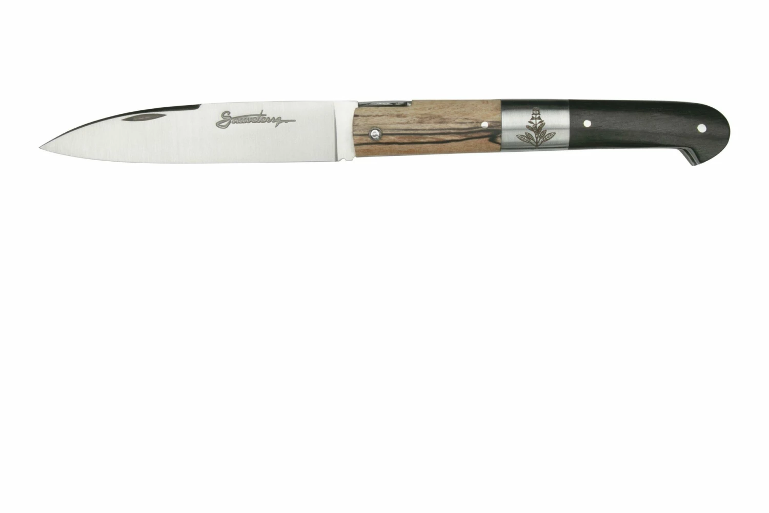 El Laguiole en Aubrac Sauveterre de haya y ébano es un cuchillo de caballero delgado y sutil. Al igual que el cuchillo de Laguiole pertenece al pueblo de Laguiole, el cuchillo de Sauveterre está indisolublemente ligado al pueblo de Sauveterre, que en su día fue votado como el pueblo más bonito de Francia. Este elegante cuchillo de caballero es el complemento perfecto.