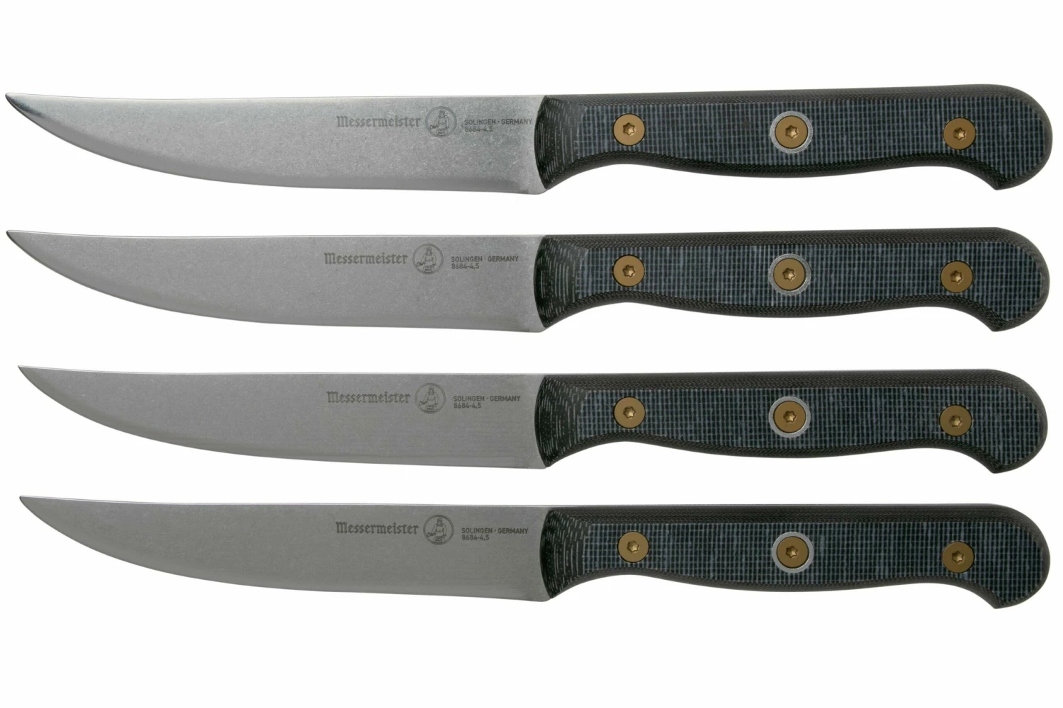 El Juego de cuchillos para carne Custom de 4 piezas de Messermeister es un elegante juego de cuchillos para carne para todos los amantes de la carne. Los cuchillos permiten cortar fácilmente filetes u otros trozos de carne sin desgarrarlos. Esto se debe a la hoja fina y afiladísima.