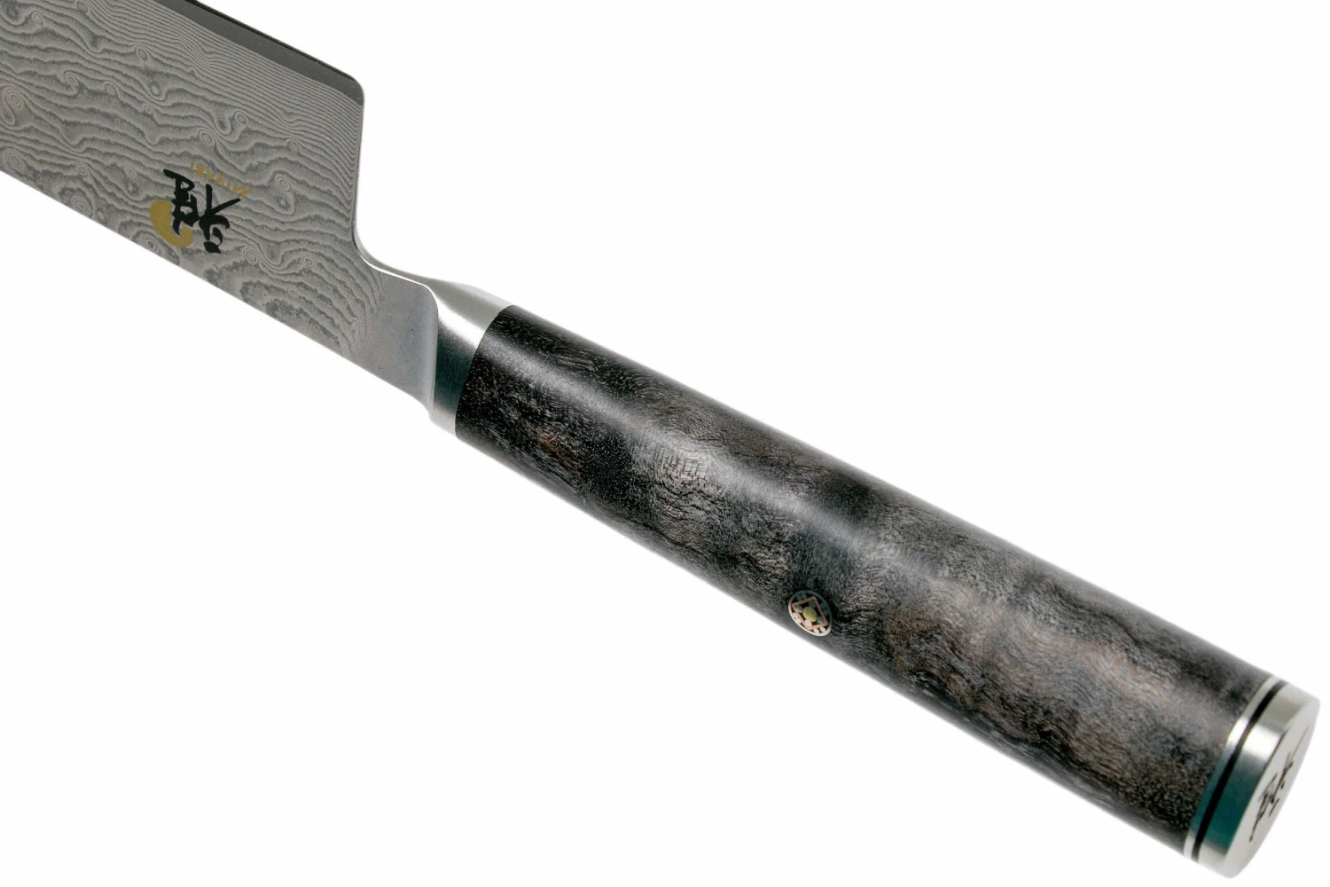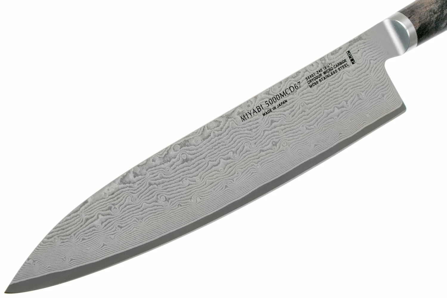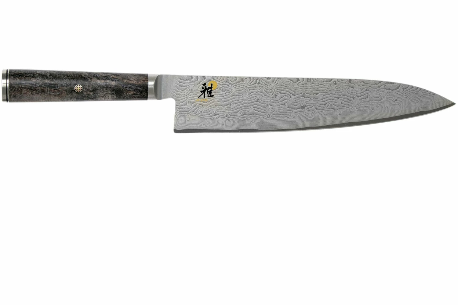El cuchillo de chef Zwilling Miyabi 5000MCD 67 de 24 cm tiene una hoja extremadamente dura y afilada de 24 cm. Puede utilizarse para cortar verduras, carne y pescado. En resumen: indispensable en toda cocina.