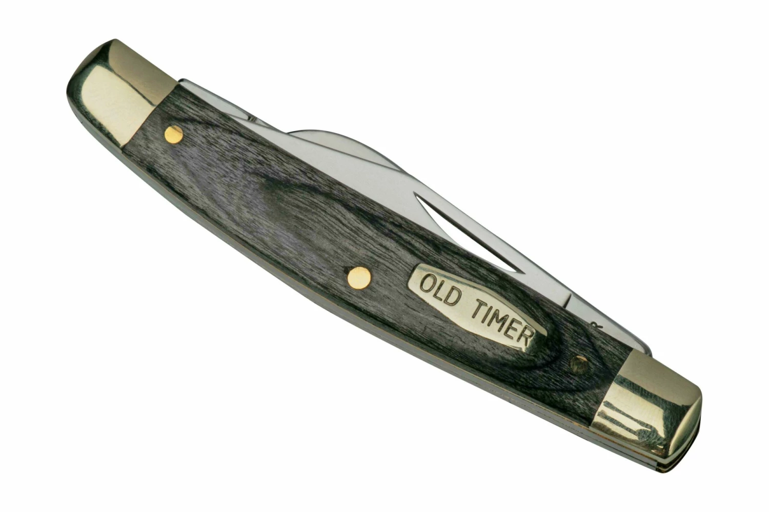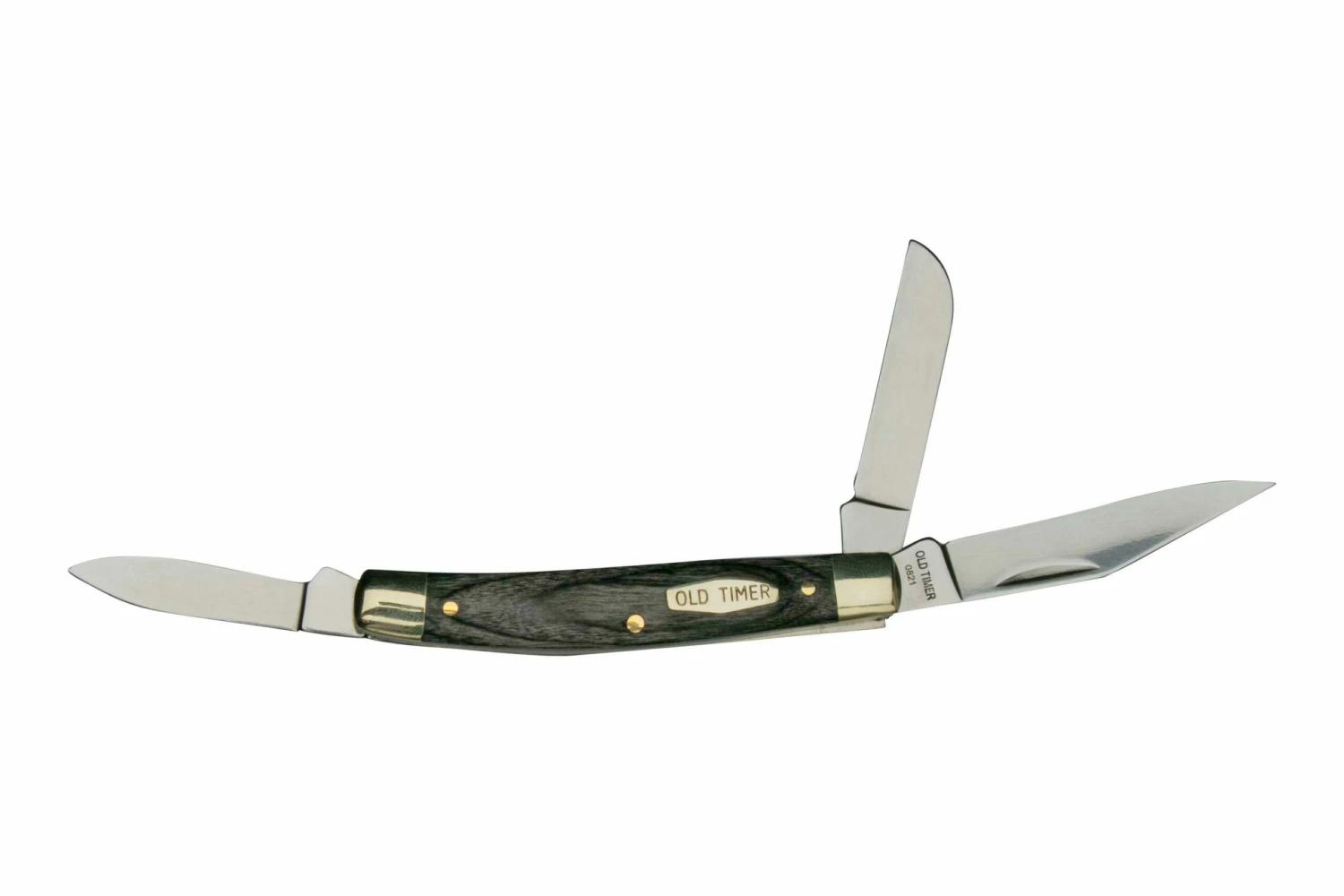 La Old Timer Middleman 1149100 es una hermosa navaja con mango de madera laminada. Es una compacta tradicional con tres hojas: una clip point, una sheepsfoot y una pluma. Las hojas se abren con las dos manos y, una vez abiertas, un slipjoint mantiene la hoja en su sitio. No es un bloqueo total, sólo algo de resistencia. Esto significa que puedes llevar estos cuchillos legalmente en casi cualquier lugar.