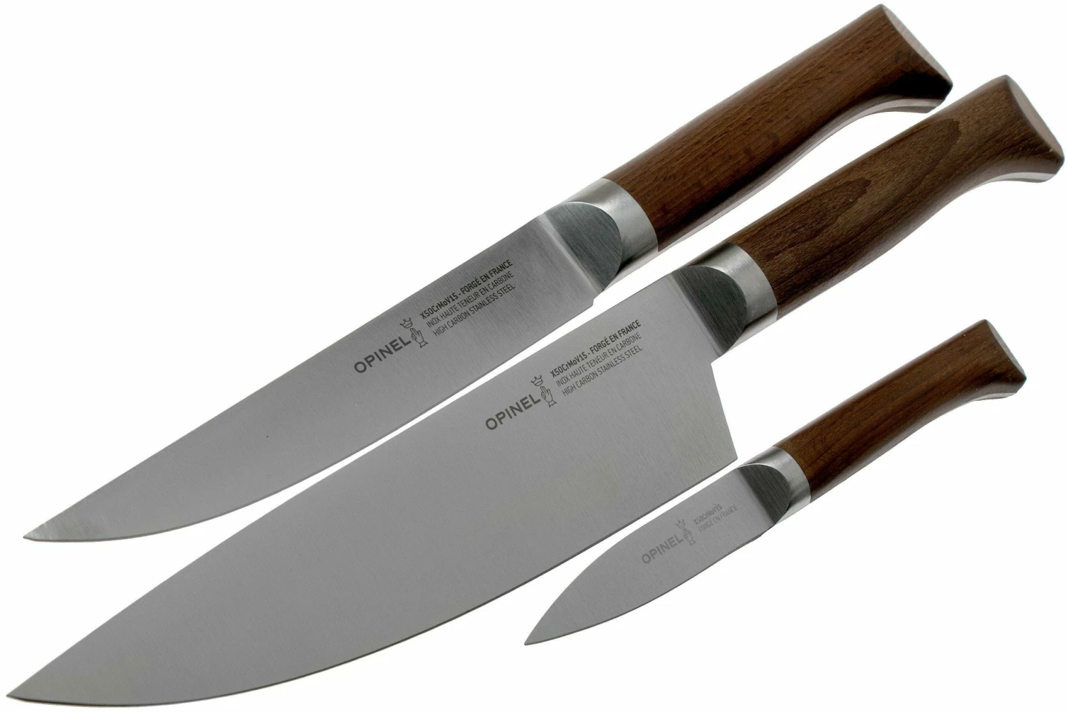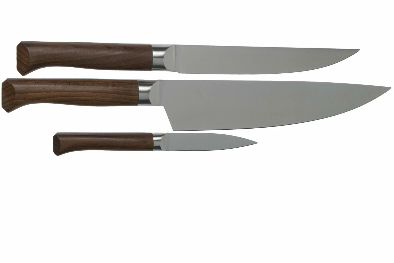 Este juego de cuchillos de tres piezas de la colección Opinel Les Forgés 1890 se compone de un cuchillo de chef de 8 cm, un cuchillo de trinchar de 16 cm y un cuchillo de pelar de 8 cm. Un bonito juego con tres cuchillos de cocina de uso frecuente. Ya sea para cortar carne, pescado, frutas, verduras o hierbas: ¡con estos cuchillos de alta calidad será pan comido!