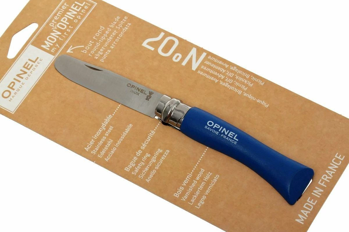 La navaja Opinel con mango de madera. Creada originalmente por Joseph Opinel en 1890 para uso de los agricultores. La navaja Opinel es una famosa navaja muy asequible para el uso diario. Puedes encontrar versiones muy pequeñas o bastante grandes. La colección “My First Opinel” está especialmente destinada a los niños. La punta redondeada minimiza el riesgo de lesiones. Por supuesto, la hoja está afilada para hacerla apta para el uso real. La colección My First Opinel está disponible en varios colores llamativos.