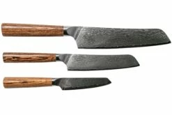 El PUMA IP Chef, Santoku, Paring Knife es un juego de cuchillos de cocina. Estos cuchillos tienen hojas de acero de Damasco VG10 y hermosos mangos de madera de pakka. Esta madera de abedul oscura da al cuchillo un aspecto tradicional y sofisticado. La colección de cuchillos de cocina PUMA IP se basa en un diseño de Ernst Siebeneicher-Hellwig y combina el acero japonés de alta calidad con un diseño y métodos de producción modernos. Todos los cuchillos de cocina IP de PUMA vienen en una bonita caja de regalo que sirve también de caja de almacenamiento e incluso de expositor.