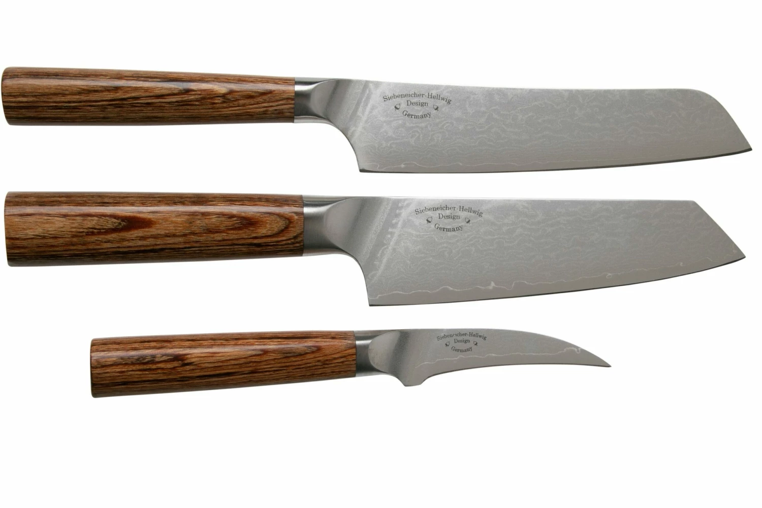 El PUMA IP Small Chef, Santoku, Paring Knife es un juego de cuchillos de cocina. Estos cuchillos tienen hojas de acero de Damasco VG10 y hermosos mangos de madera de pakka. Esta madera de abedul oscura da al cuchillo un aspecto tradicional y sofisticado. La colección de cuchillos de cocina PUMA IP se basa en un diseño de Ernst Siebeneicher-Hellwig y combina el acero japonés de alta calidad con un diseño y métodos de producción modernos. Todos los cuchillos de cocina IP de PUMA vienen en una bonita caja de regalo que sirve también de caja de almacenamiento e incluso de expositor.