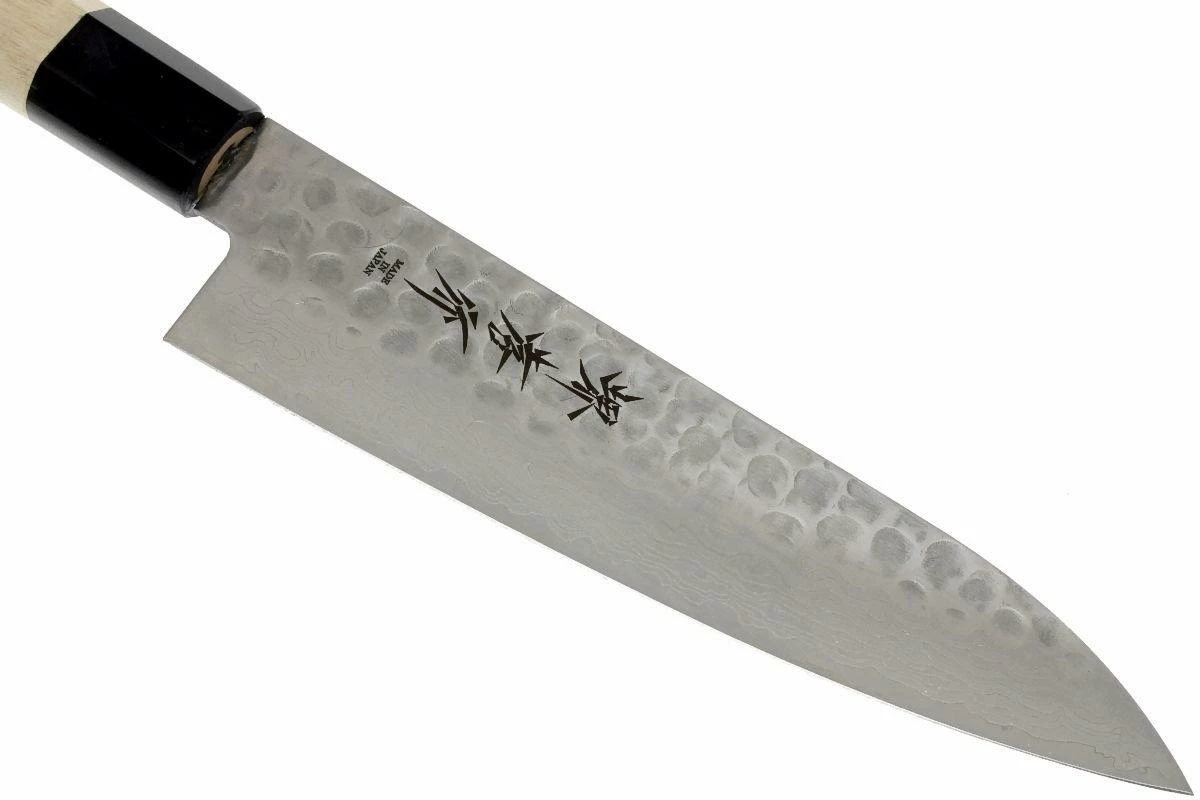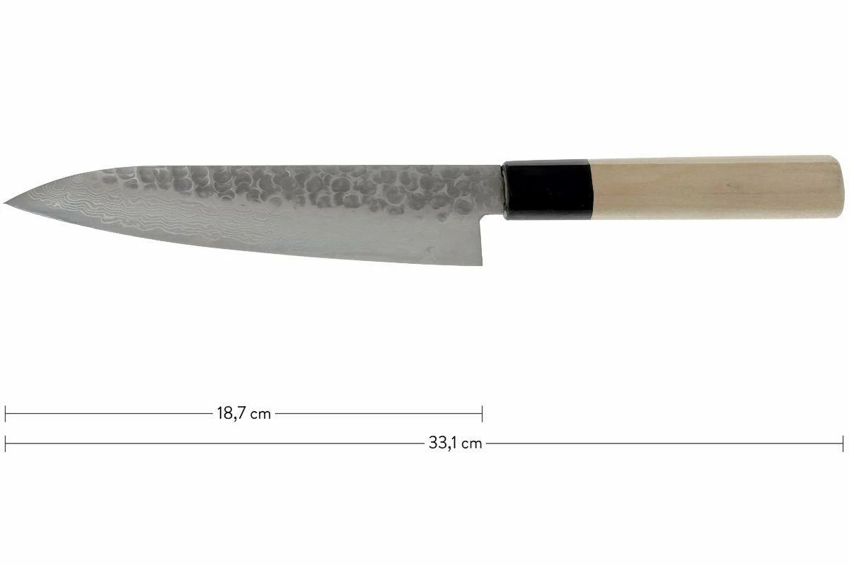 El cuchillo santoku de la colección Damasco de 45 capas de Sakai Takayuki. Este cuchillo de chef, también llamado gyuto, es el más pequeño de los tres cuchillos de chef de la colección.