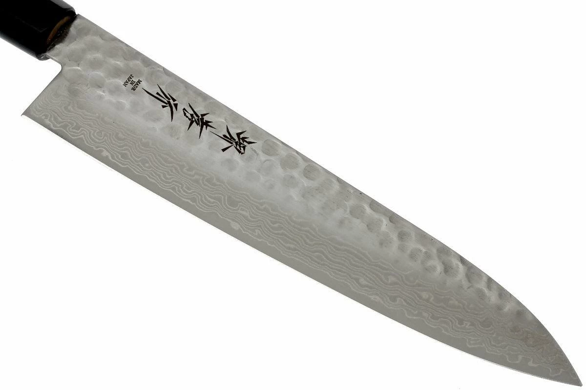 El cuchillo de chef de 21 cm de la colección Damasco de 45 capas de Sakai Takayuki. Este cuchillo de chef, también llamado gyuto, es el cuchillo de tamaño medio de los tres cuchillos de chef de la colección.