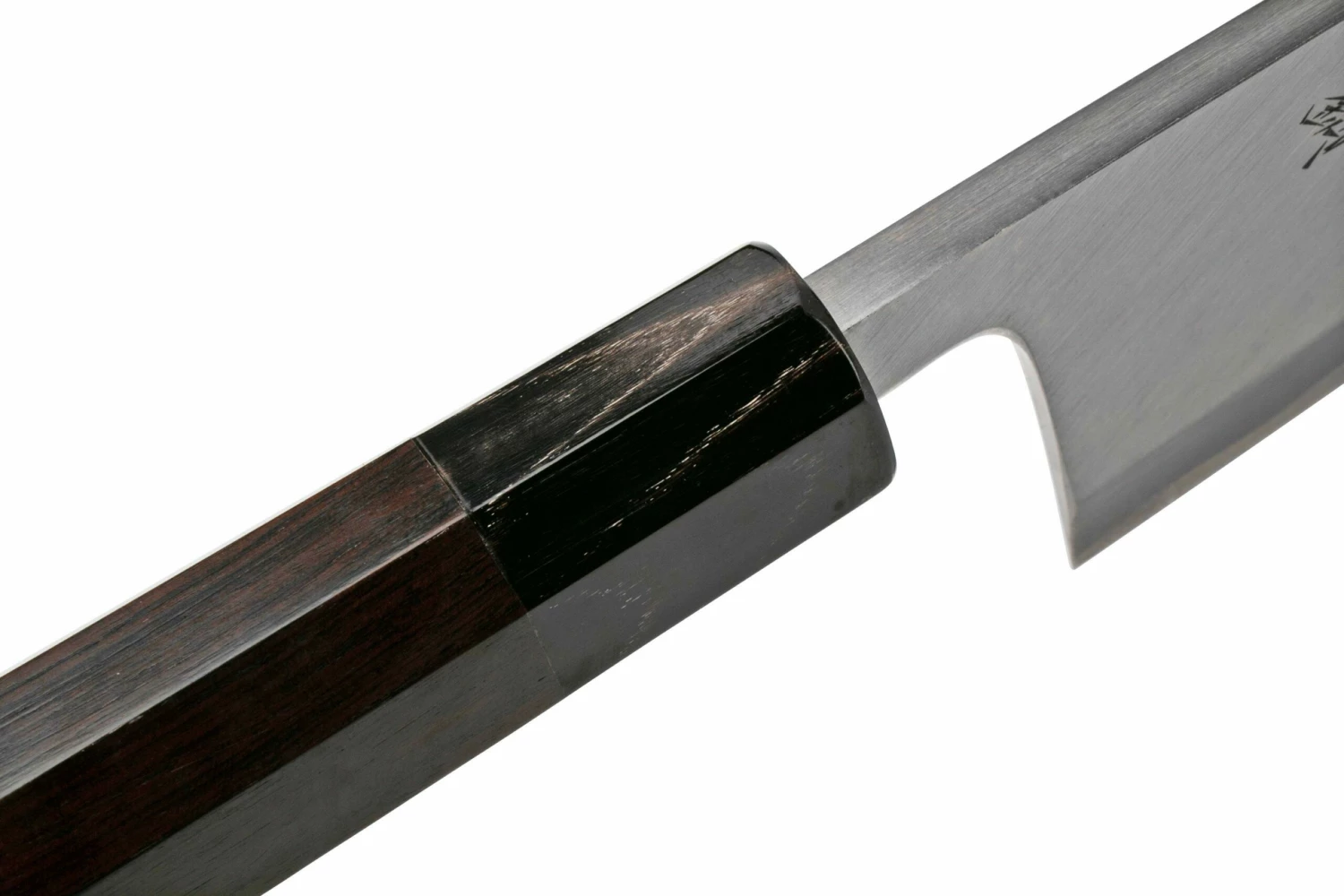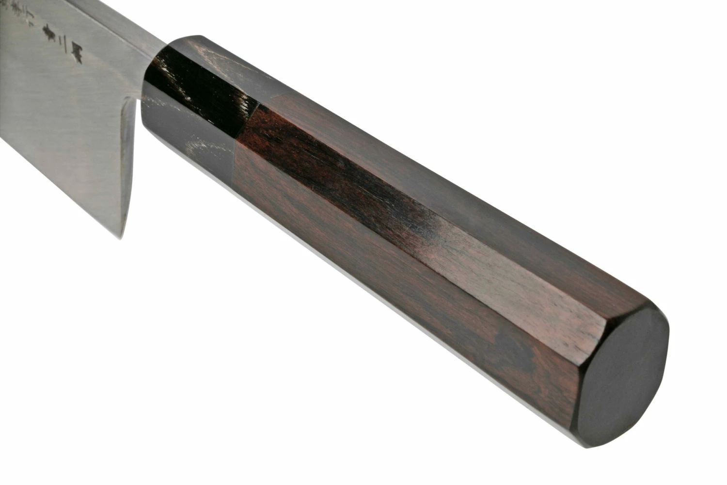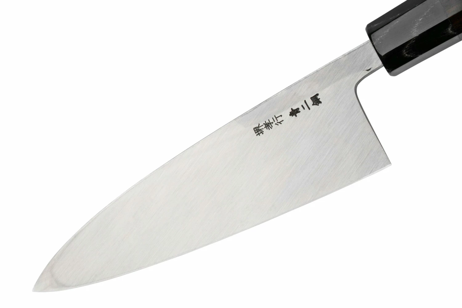 El Sakai Takayuki Blue 2 Steel Japanese Style 01237 deba 18 cm es un robusto cuchillo de cocina japonés. El deba fue diseñado originalmente para filetear y preparar carne y pescado. La hoja es más gruesa que la de un cuchillo de cocina medio, lo que te permite cortar huesos pequeños, ligamentos y tendones sin dañar el filo del cuchillo. Este cuchillo está afilado por un lado, mientras que el otro está ahuecado. Esto asegura que la carne o el pescado no se pegue y se caiga de la hoja con facilidad mientras estás cortando.