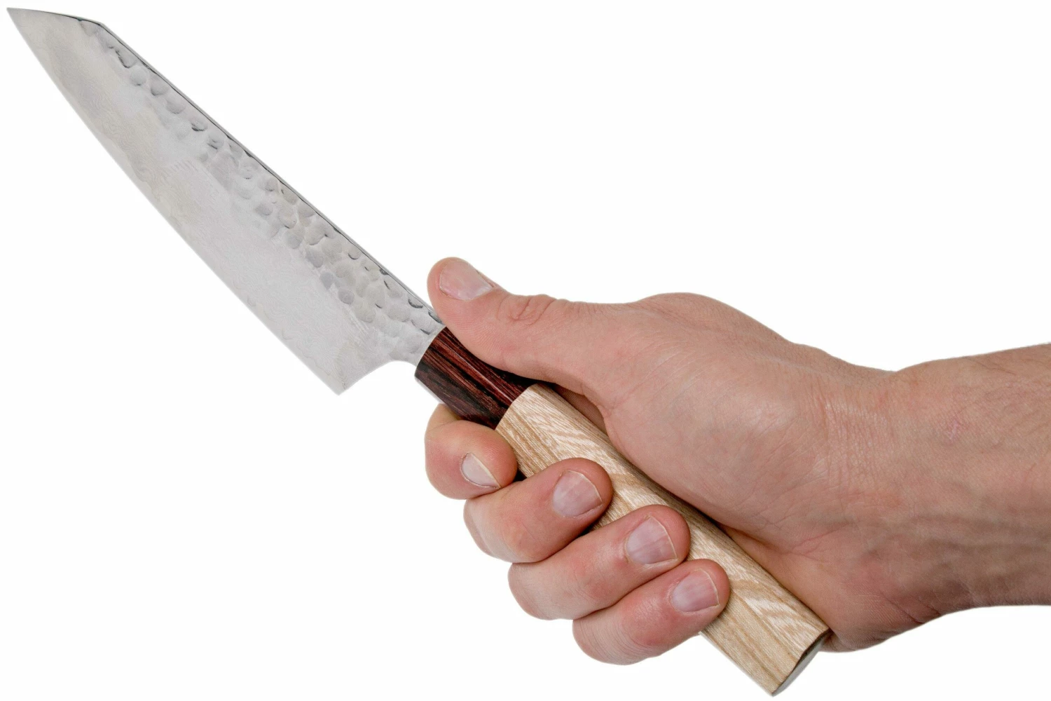 El cuchillo Sakai Takayuki bunka 16 cm de la colección VG10 Damasco Hammered WA de 33 capas está mejorado con una hoja kengata. Significa ‘parecido a una espada’ y se refiere a la forma de la hoja que se inclina bruscamente en la punta. Aparte de eso, el cuchillo puede considerarse un miembro de la familia santoku. Con la punta estrecha puedes cortar finamente carne, pescado y verduras.