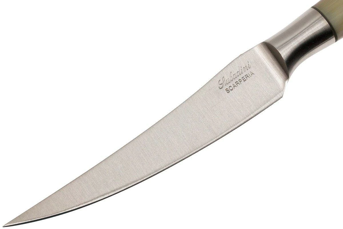 Con un juego de cuchillos para carne de Saladini introducirás en tu hogar herramientas de primera calidad. Este set contiene seis cuchillos para carne en una elegante caja de madera. Los cuchillos miden 23 cm de largo, con un mango de 10 cm y 13 cm de largo. Los mangos de este juego están hechos de un impresionante cuerno de buey.