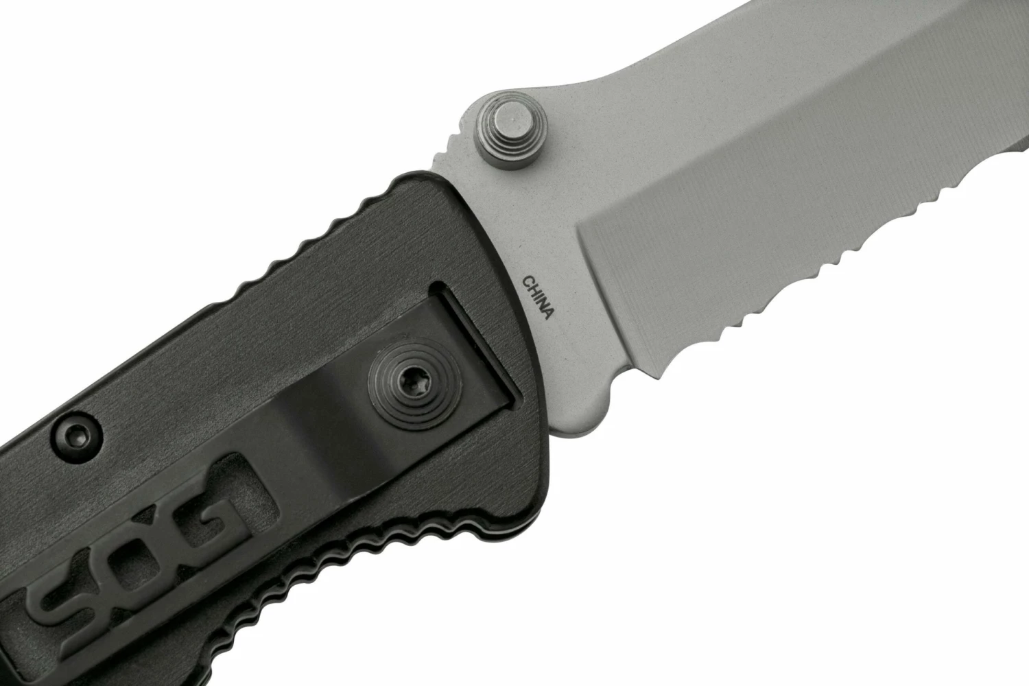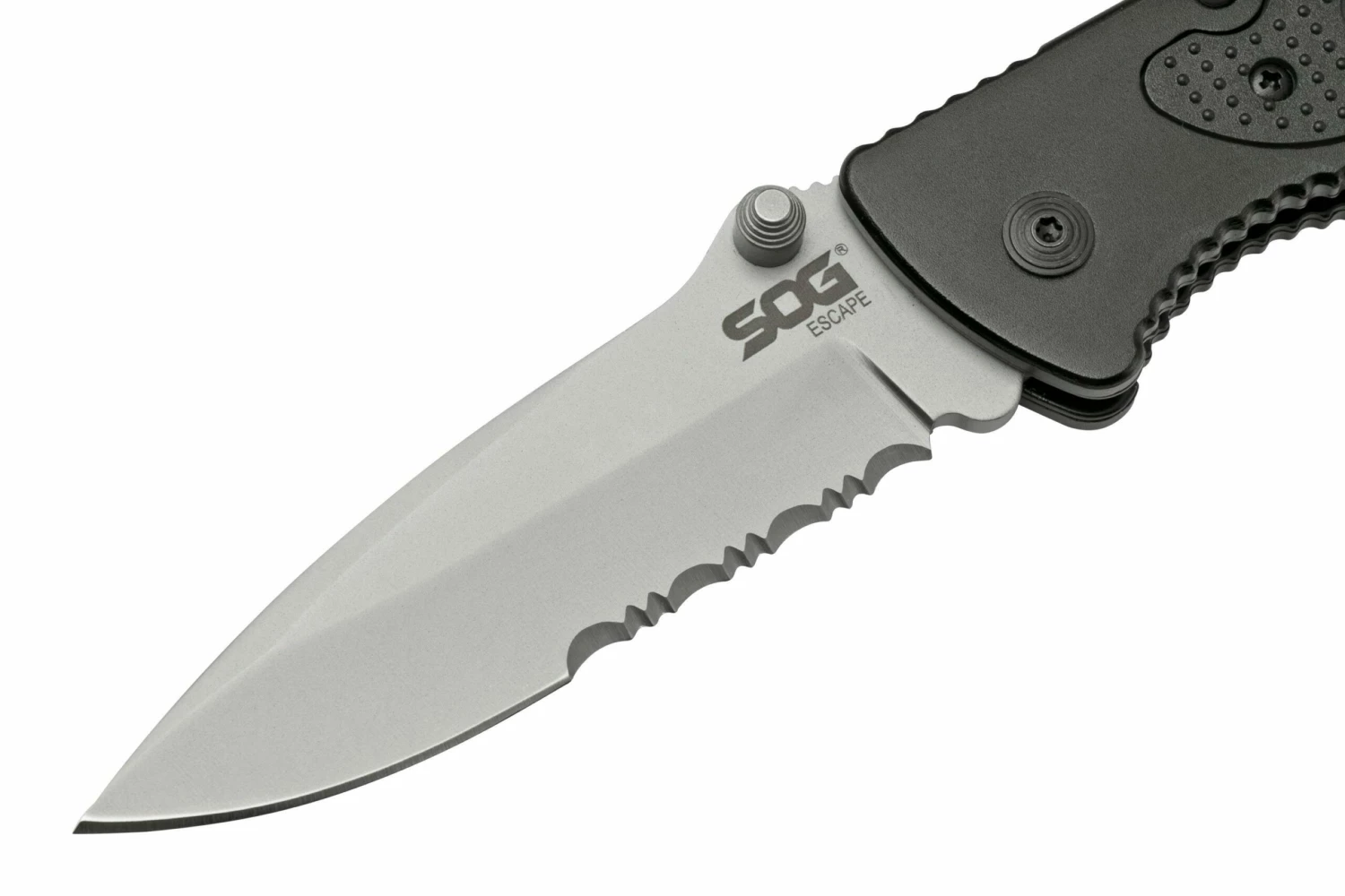 La SOG Escape es una práctica navaja EDC con muchas funciones. La base del mango está reforzada con un rompe cristales y un gancho de corte, perfecto para los primeros auxilios. Debido a que el mango está hecho de aluminio, la SOG Escape es agradable y ligera para su tamaño. Por lo tanto, puedes llevarla fácilmente contigo a diario. La hoja se abre a través del pasador de pulgar y, una vez abierta, la hoja se bloquea mediante un sólido backlock.