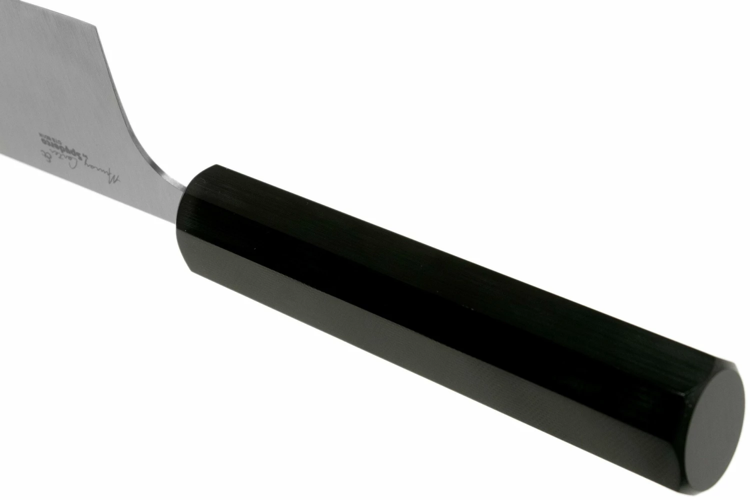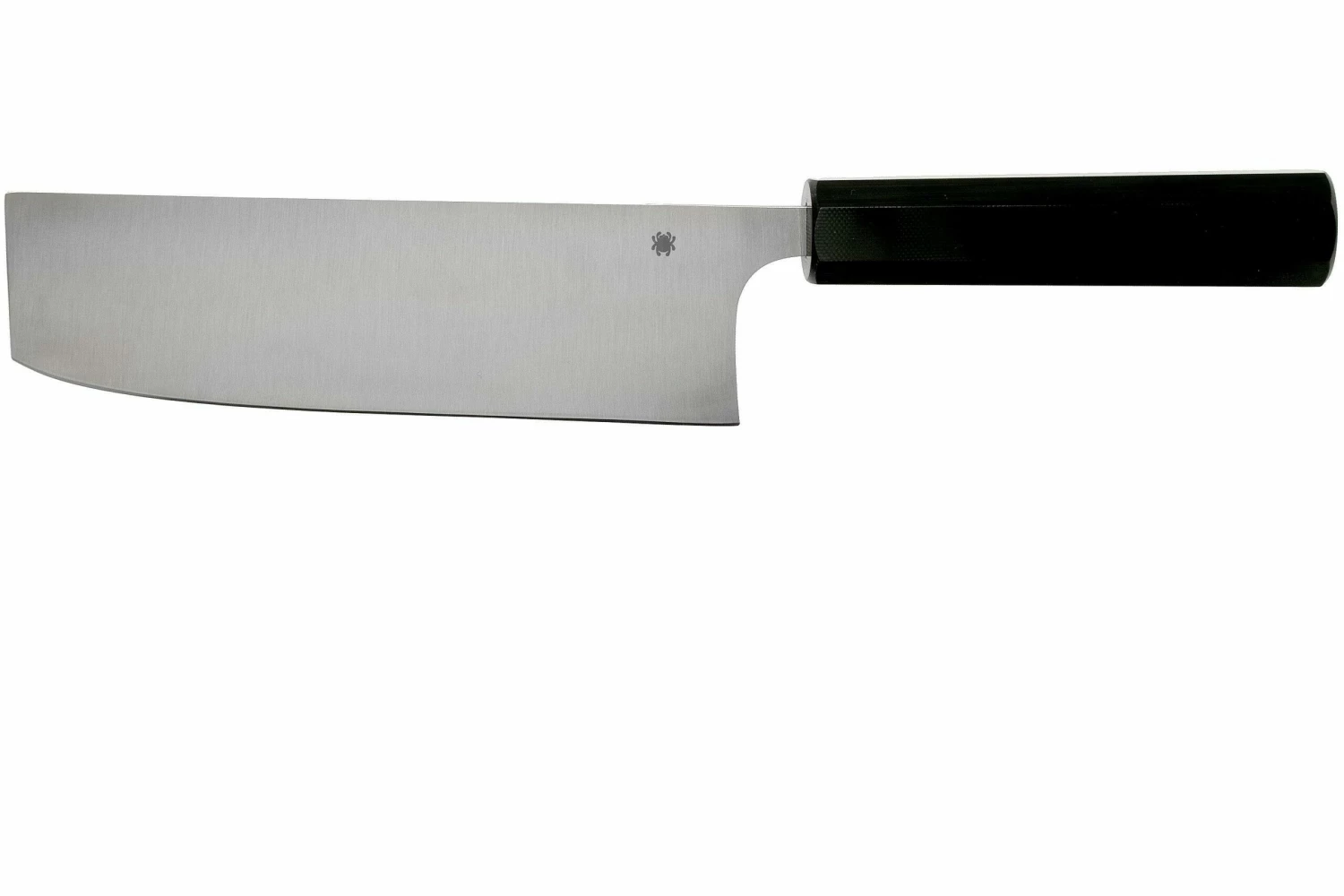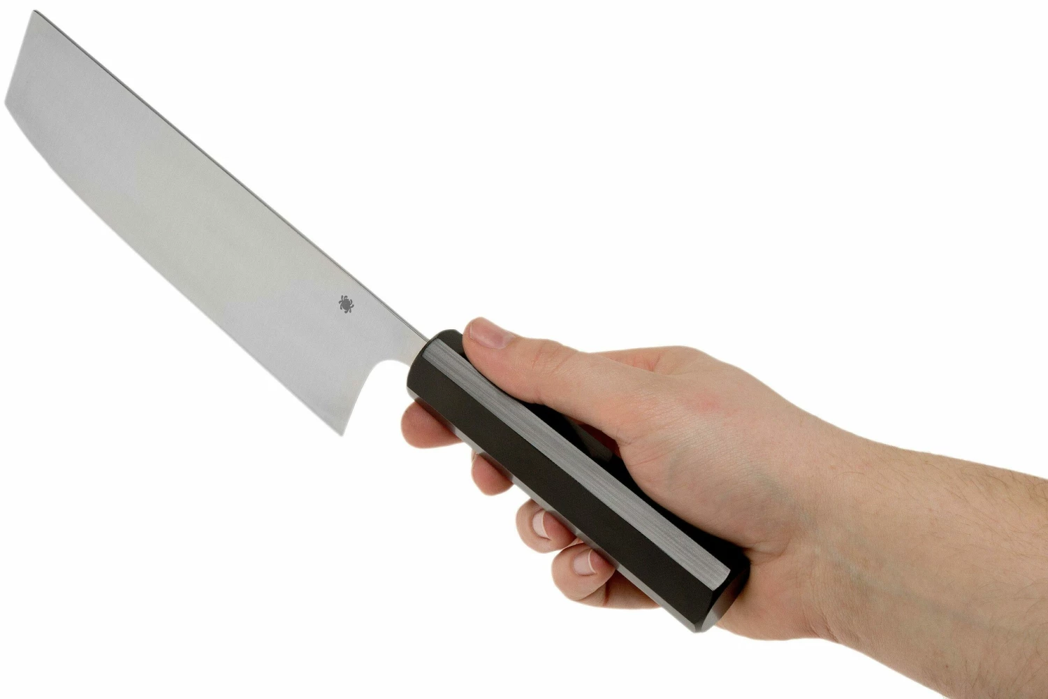 Este cuchillo Spyderco Nakiri de la Colección Murray Carter Wakiita es de una belleza impresionante. Nakiri significa “cortador de verduras”. Su forma única y rectangular hace que este cuchillo sea perfecto para cortar todo tipo de verduras. La punta del cuchillo es ligeramente redondeada para asegurarte que también puede cortar rápidamente verduras en ángulo. Además, podrás cortar hierbas en porciones minúsculas con gran facilidad.