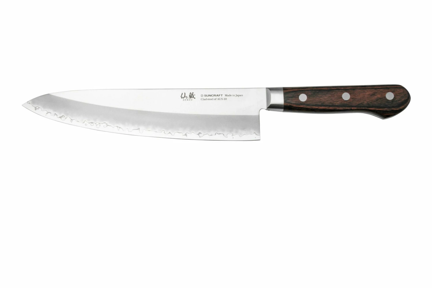 El cuchillo de chef Suncraft Senzo Clad AS-03 de 21 cm es un práctico cuchillo de cocina japonés. La hoja es lo suficientemente grande como para realizar casi todas las tareas de corte diarias en la cocina. El cuchillo está bien equilibrado y tiene un filo afilado. Este cuchillo de chef es ideal para cortar todo tipo de verduras, carne y pescado.