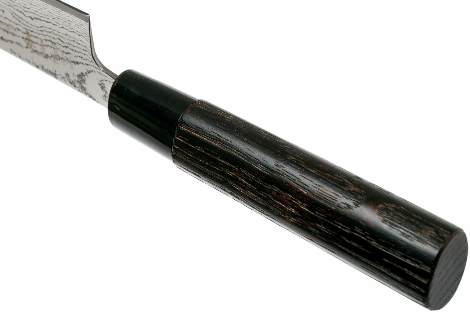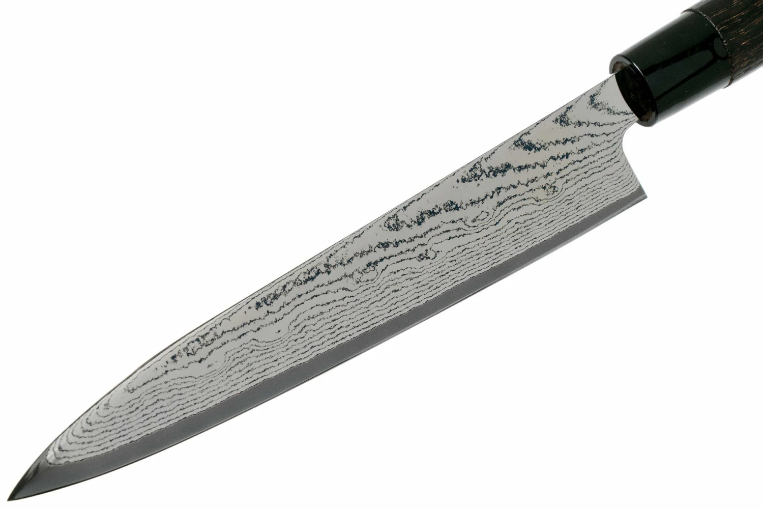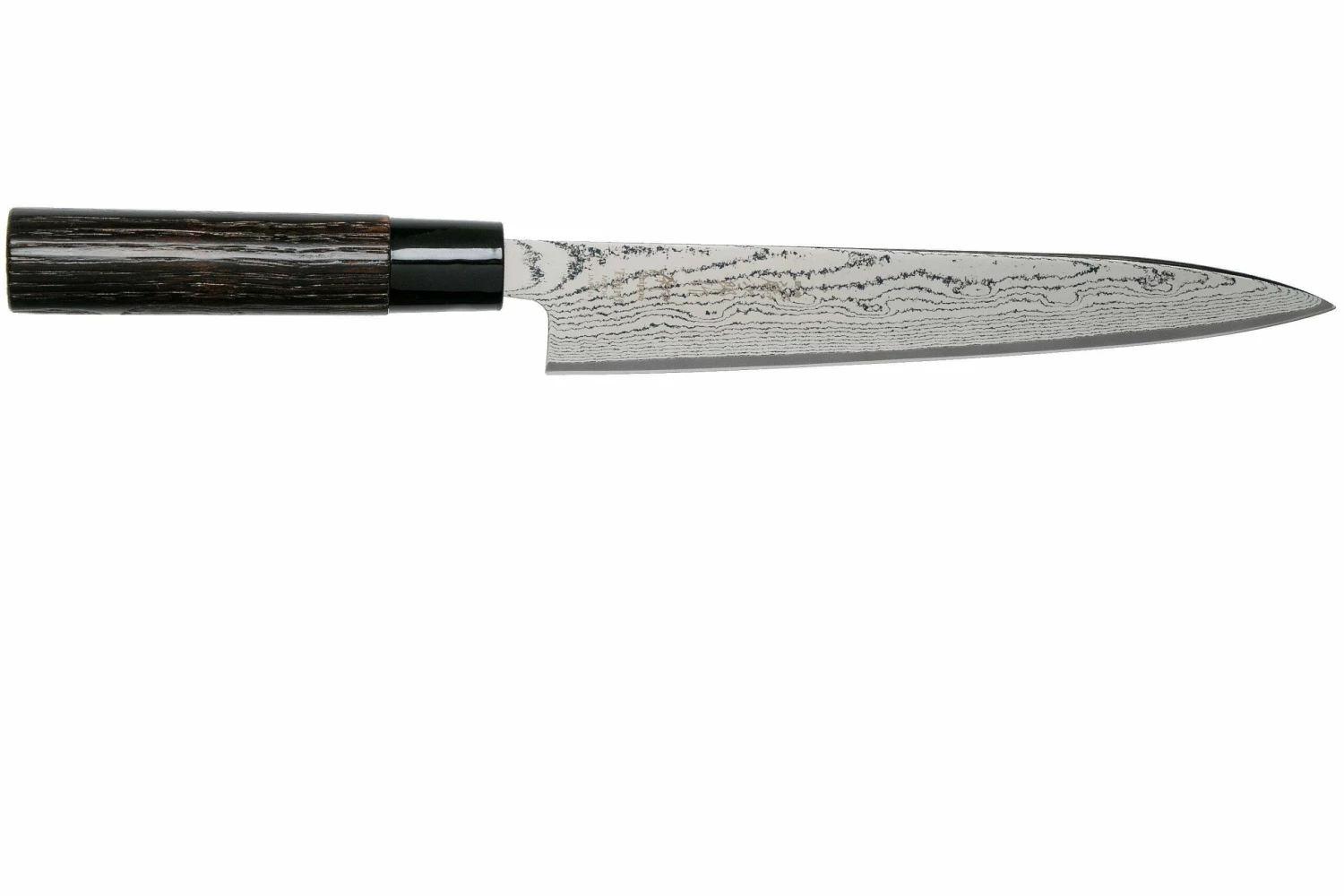 El cuchillo de trinchar Tojiro Shippu Black de damasco 21 cm es, por su hoja fina y estrecha, perfecto para cortar finas lonchas de carne o pescado. Con la técnica adecuada, únicamente un movimiento con la hoja de 21 cm de longitud será suficiente para acabar con la rodaja fina perfecta.