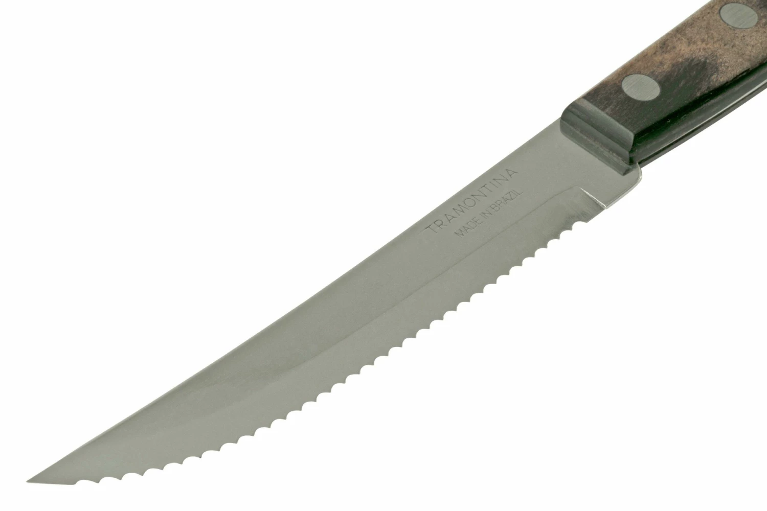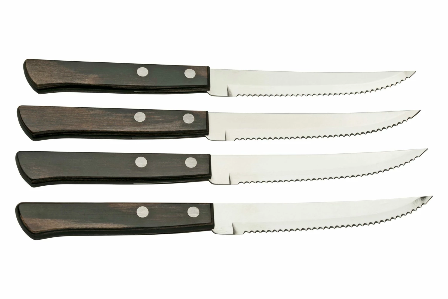 Este Juego de cuchillos Churrasco de 4 piezas para carne y pizza es un juego económico y práctico compuesto por cuatro cuchillos de mesa dentados. Adecuado para su uso en restaurantes o simplemente en casa. Gracias a las sierras puedes cortar fácilmente la corteza dura de una pizza recién horneada o un filete a la parrilla.