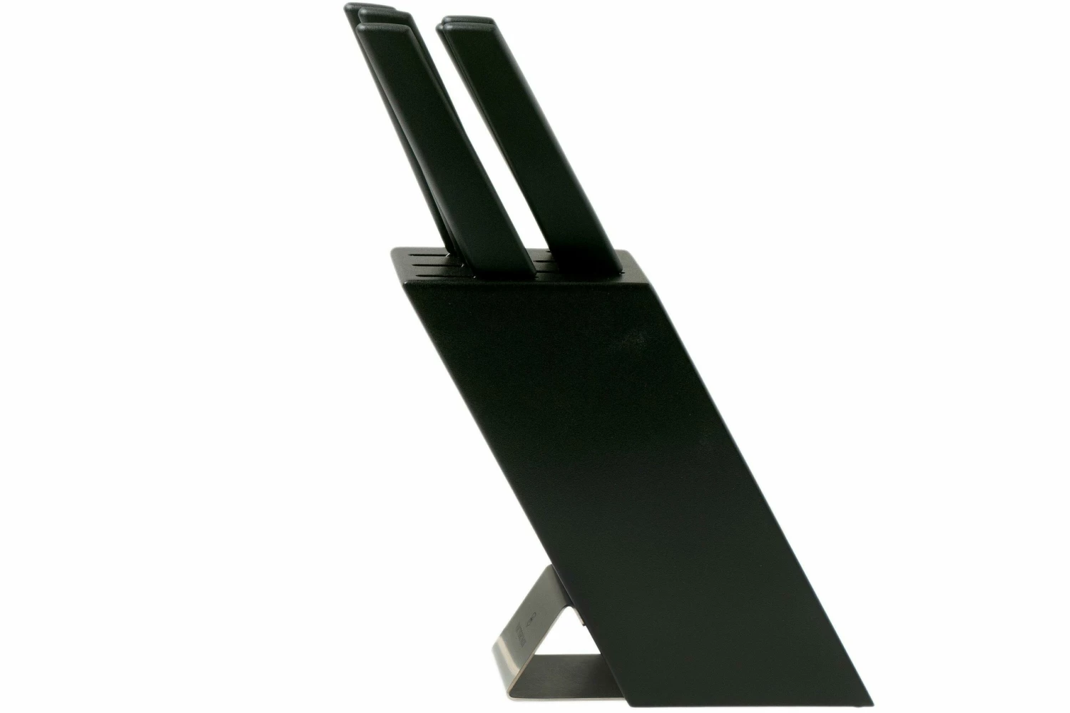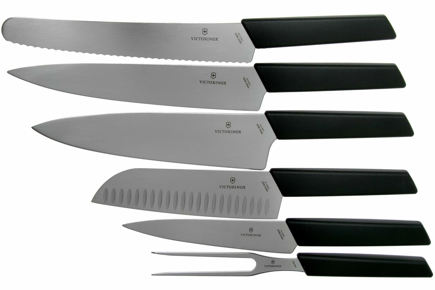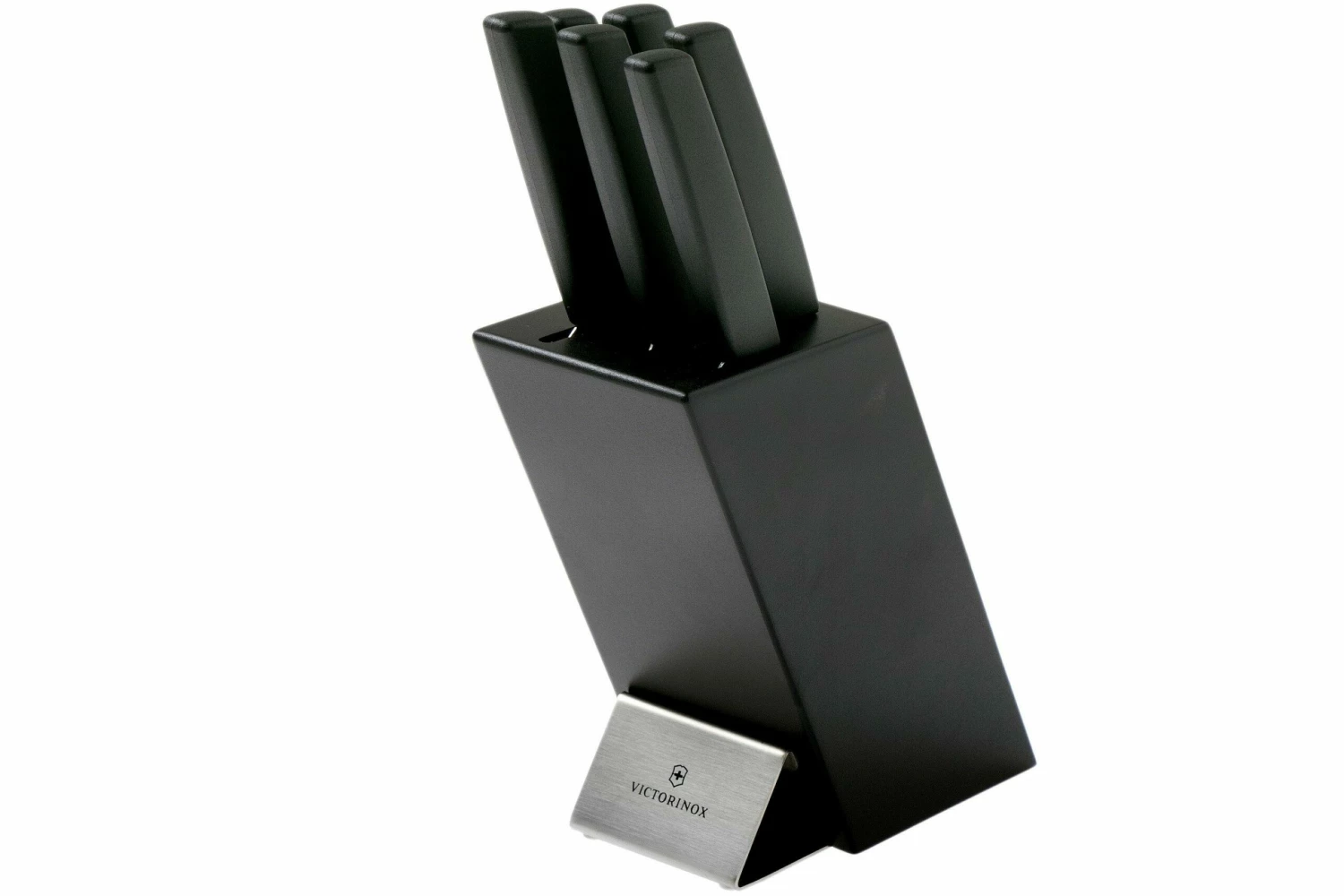 El Juego de cuchillos Victorinox Swiss Modern de 6 piezas negro es un complemento elegante y con estilo para tu cocina. Fabricado en madera de haya lacada en negro, lo que le da un aspecto muy moderno. El reconocible logotipo de Victorinox está sutilmente grabado en la base de metal.