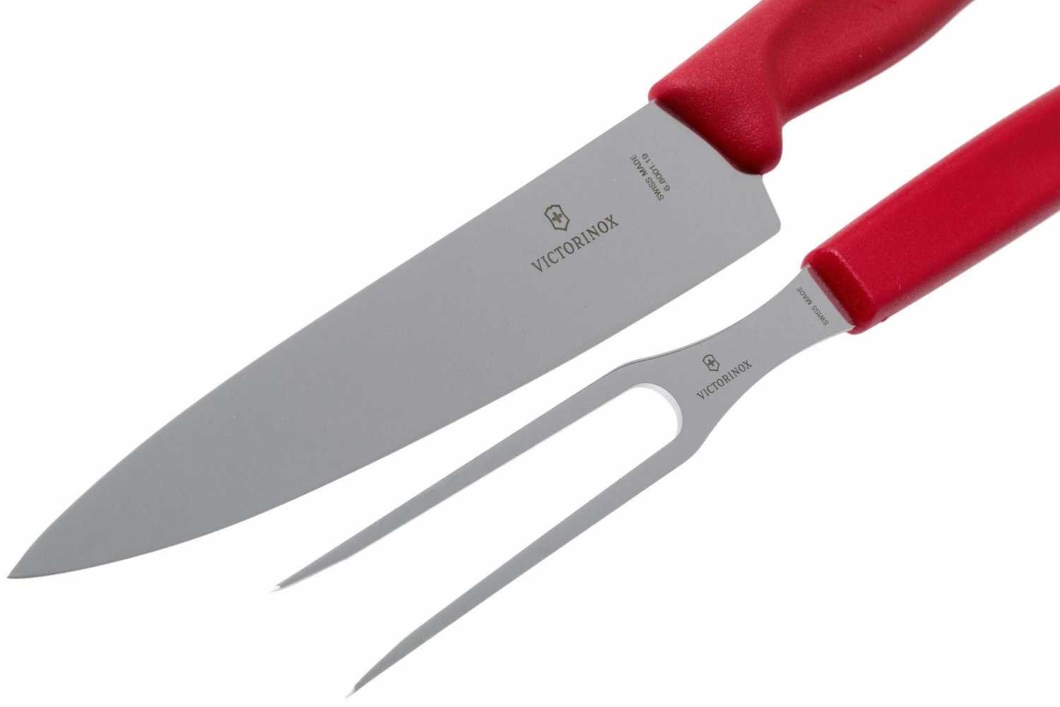 Este Juego de cuchillos para trinchar de 2 piezas Victorinox SwissClassic, rojo es un set profesional y práctico para todo amante de la carne. Con este cuchillo para trinchar podrás cortar fácilmente los trozos de carne más finos y con el tenedor para carne podrás mantener la carne en su sitio mientras la cortas. Debido al color rojo de los mangos, este juego es perfecto para su uso en cocinas profesionales. En las cocinas profesionales, el color rojo se utiliza sobre todo para cortar la carne. Por supuesto, también puedes utilizar este set en casa.