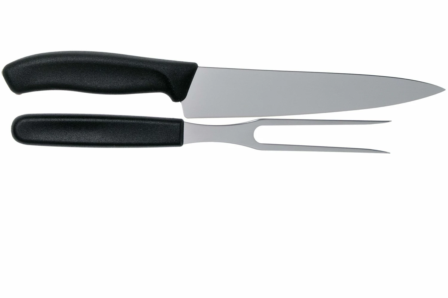 Este Juego de cuchillos para trinchar de 2 piezas Victorinox SwissClassic, negro es un set profesional y práctico para todo amante de la carne. Con este cuchillo para trinchar podrás cortar fácilmente los trozos de carne más finos y con el tenedor para carne podrás mantener la carne en su sitio mientras la cortas.