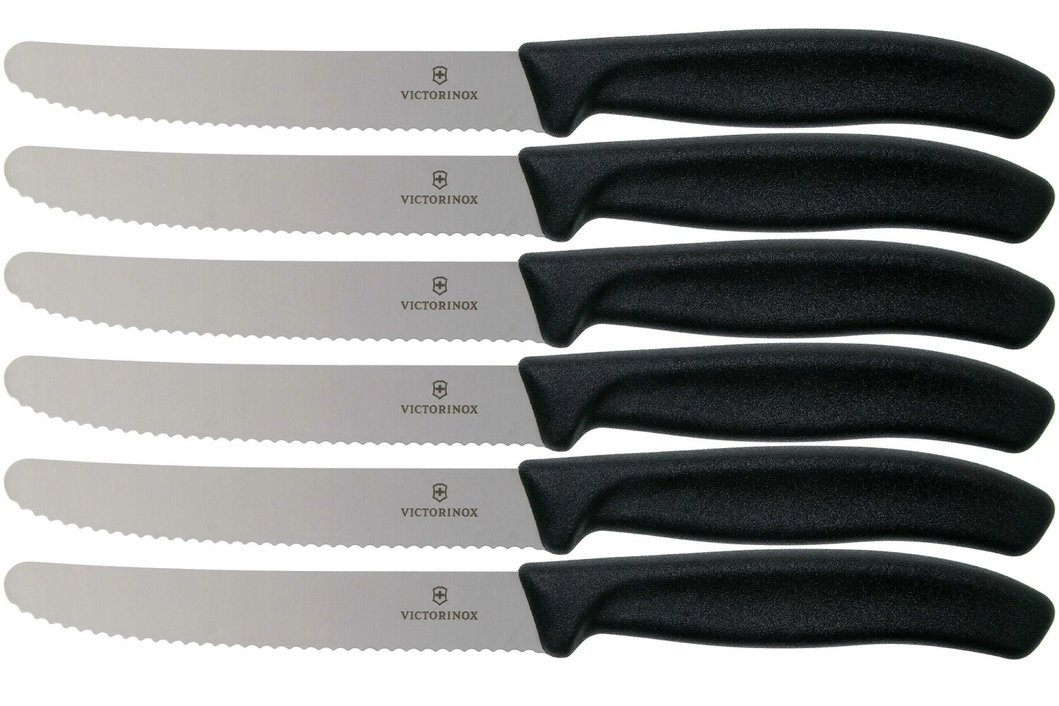 El juego de cuchillos tomateros Victorinox SwissClassic de 6 piezas es un práctico juego de cuchillos tomateros dentados. Unas hojas muy afiladas para todas las cocinas. Gracias a los materiales utilizados, los cuchillos para carne son bonitos y ligeros y muy versátiles.
