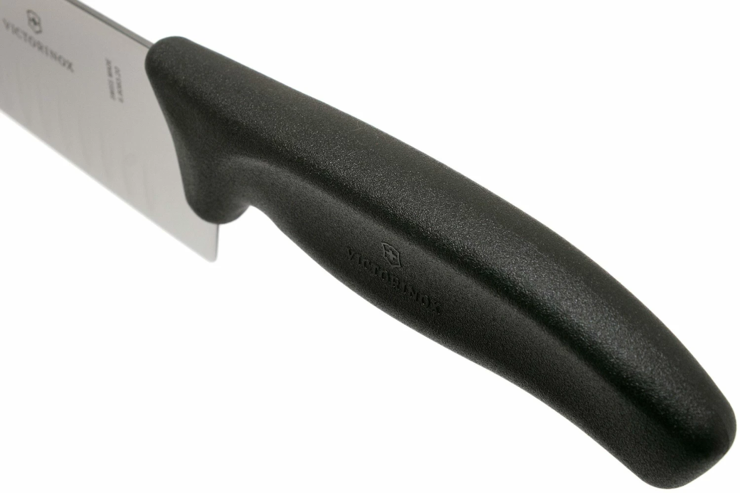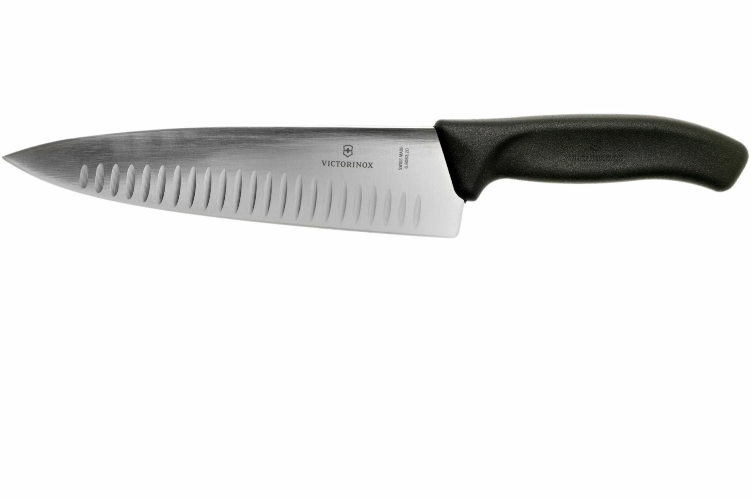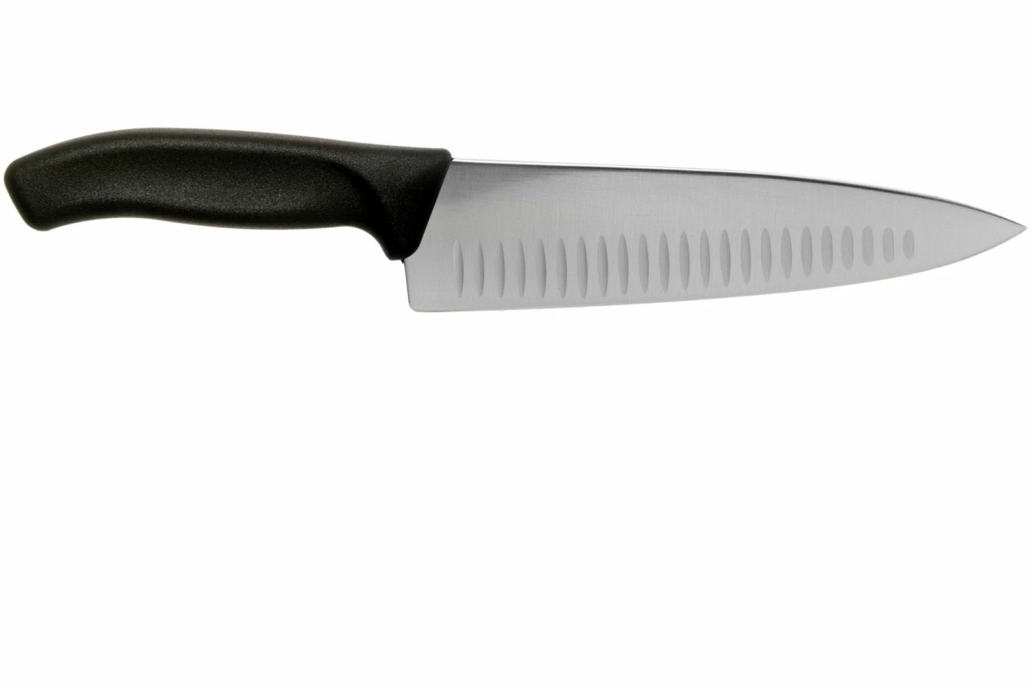 El cuchillo de chef Victorinox SwissClassic 20 cm con hoyuelos, negroes un práctico utensilio polivalente. Con su hoja de 20 cm es un buen cuchillo de tamaño medio. Lo suficientemente grande como para cortar un pollo grande, pero también lo suficientemente práctico como para picar finamente el ajo. La hoja baja está mejorada con hoyuelos para asegurar que la comida no se pegue a la hoja.