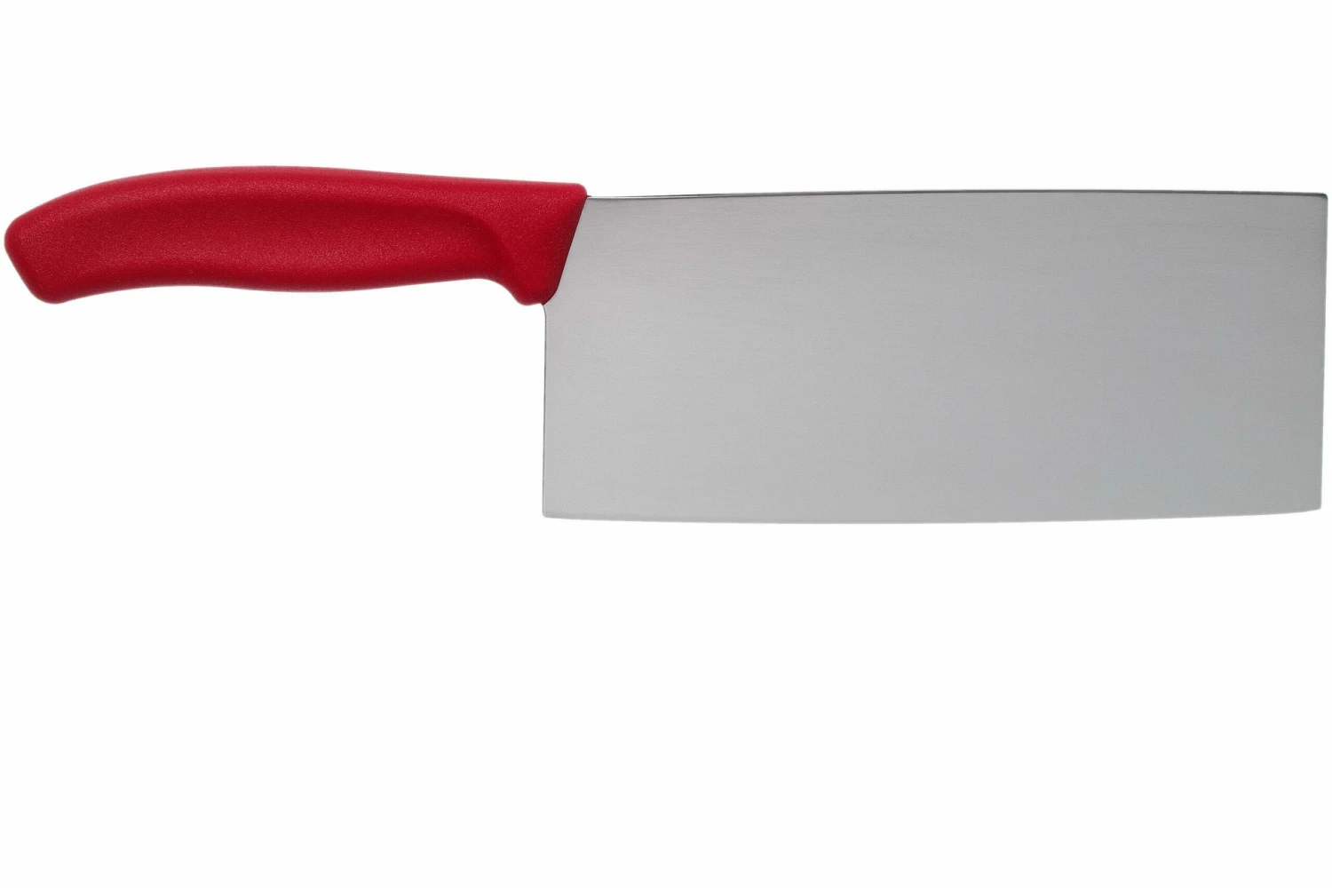 El cuchillo de chef chino Victorinox SwissClassic 18 cm, rojoes un cuchillo tradicional para verduras. Es perfecto para cortar verduras y frutas. Pero no te equivoques, ¡esto no es una cuchillo de carnicero! Mientras que la hoja de un cuchillo de carnicero es robusta, la de un cuchillo de chef chino es fina y está muy afilada. Por lo tanto, este cuchillo no se puede utilizar para cortar.