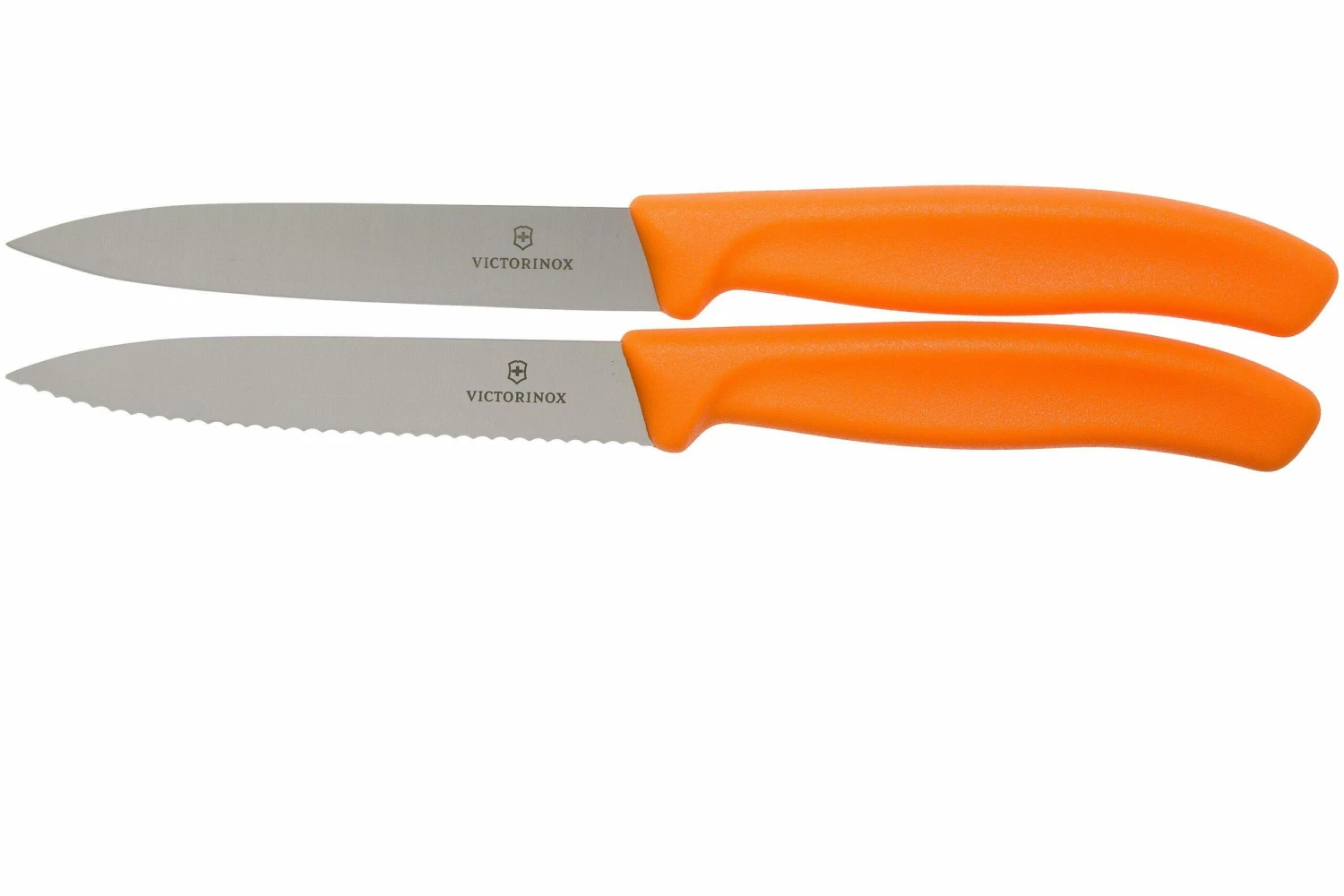 Estos dos cuchillos para verduras Victorinox SwissClassic naranja 10 cm son adiciones versátiles a cualquier cocina y en la mesa. Este juego se compone de un cuchillo de verduras de 10 cm dentado y un cuchillo de verduras de 10 cm con filo liso. Gracias a su fino filo, pelar la fruta y la verdura será un juego de niños.