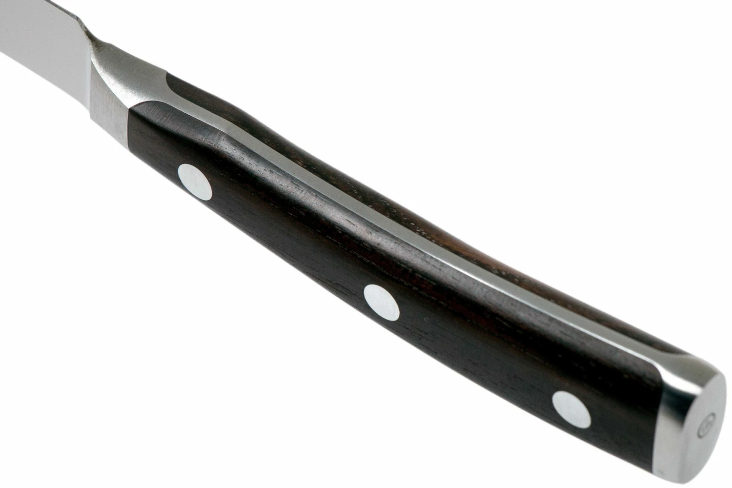 El cuchillo para carne Ikon 12 cm de Wüsthof es un impresionante cuchillo para carne con un aspecto y tacto de lujo. El filo no se ha mejorado con dentados, sino que es simplemente afilado como debe ser un cuchillo de carne de alta calidad.