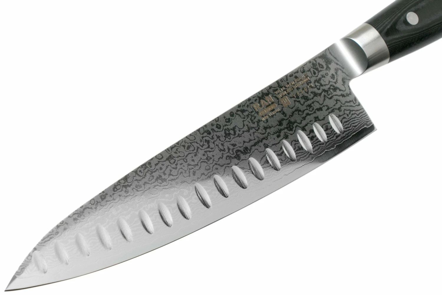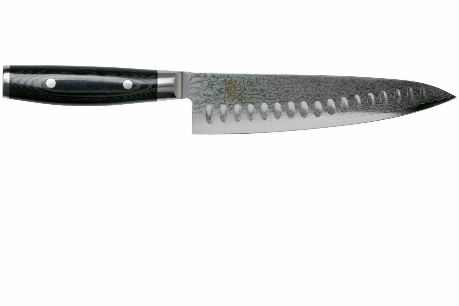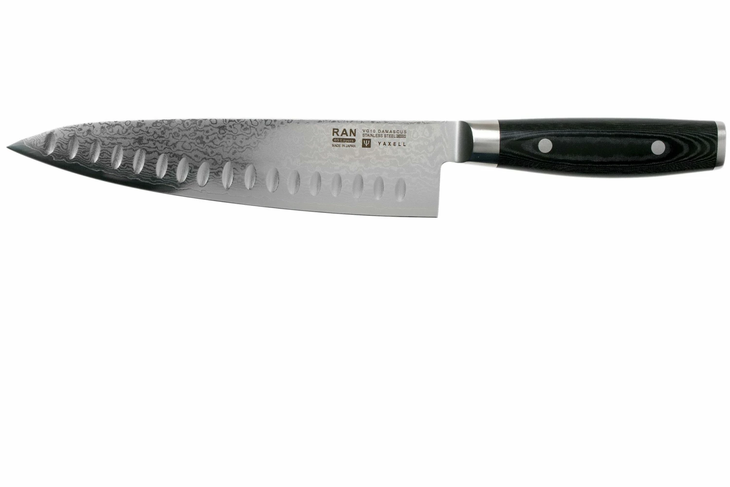 El cuchillo de chef Yaxell Ran con hoyuelos de 20 cm es un cuchillo de chef japonés. El cuchillo es un verdadero todoterreno en la cocina. Lo suficientemente grande para cortar carne, pescado o verduras a medida, y lo suficientemente pequeño para cortar hierbas o dientes de ajo. Los hoyuelos de la hoja garantizan que ningún ingrediente se pegue a la misma. El cuchillo es fácil de usar gracias a su correcto equilibrio y a su afilado filo.