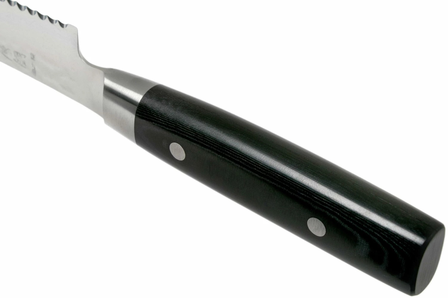 El cuchillo de pan Zen de Yaxell es un elegante cuchillo de pan japonés. Con la hoja dentada de 23 cm de longitud podrás cortar todo tipo de pan: desde cortezas duras a blandas, desde bollos a baguettes. Pero puedes utilizar el cuchillo para algo más que para el pan. También es ideal para pasteles y tartas. Y qué decir de las verduras y frutas duras, como los melones, las calabazas y los apios.