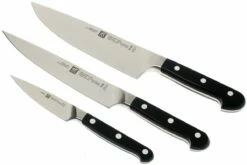 El Juego de cuchillos Zwilling Pro de 3 piezas es un práctico juego para tareas grandes y pequeñas en la cocina. Contiene un cuchillo de chef para cortar grandes trozos de carne y verduras, un cuchillo de trinchar para cortar buenas lonchas de carne y un cuchillo de pelar para el resto de tareas de corte.