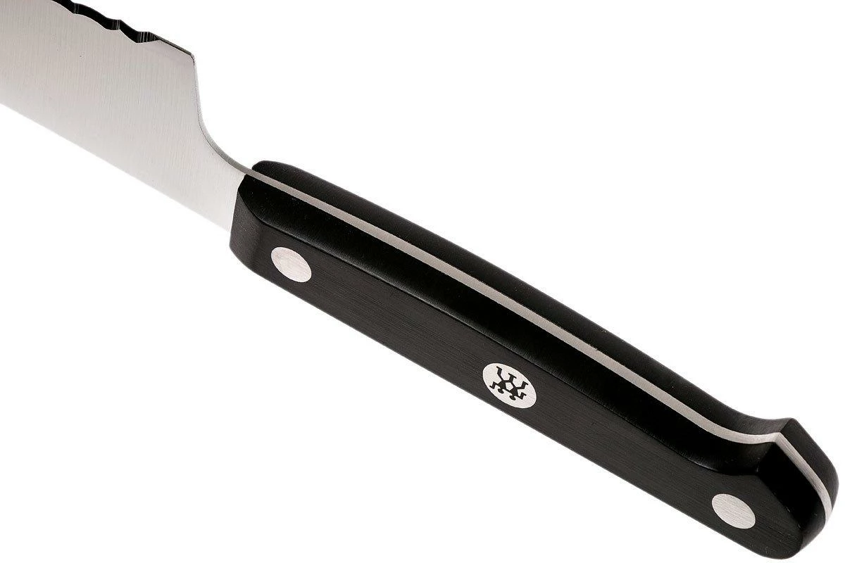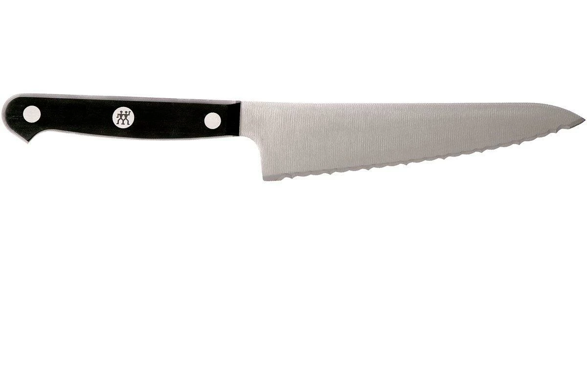 El cuchillo de chef Zwilling Gourmet, compacto dentado de 14 cm es un cuchillo de cocina versátil para diversas tareas de corte. Destacan los dentados: algunos dentados ondulados se alternan con dentados puntiagudos. Por ello, el cuchillo no es únicamente ideal para cortar carne, pescado o verduras, sino también pan, bollos y rosquillas. Gracias a su tamaño compacto, también es fácil de usar. En resumen: un auténtico todoterreno. El cuchillo forma parte de la colección Zwilling Gourmet. Una amplia colección de cuchillos de cocina con un diseño clásico de tres remaches.