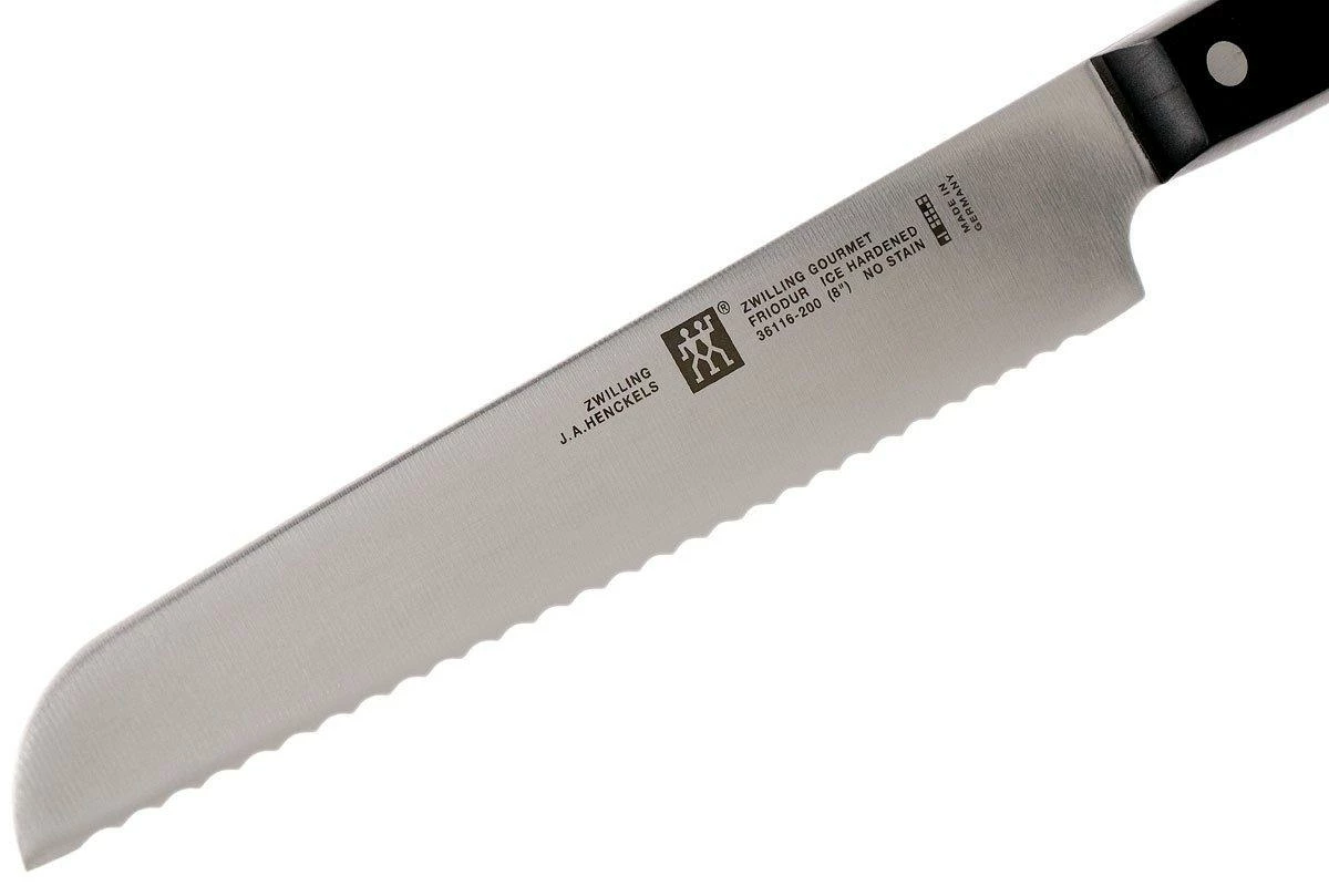 Con el cuchillo para pan Zwilling Gourmet 20 cm cortar el pan será un juego de niños. Tanto si necesitas cortar una barra de pan, una baguette, un bollo o incluso una piña: este cuchillo para pan puede hacerlo todo. Al cortar tú mismo el pan, el sabor es perfecto y puedes determinar el grosor de las rebanadas. El cuchillo forma parte de la colección Zwilling Gourmet. Una amplia colección de cuchillos de cocina con un diseño clásico de tres remaches.